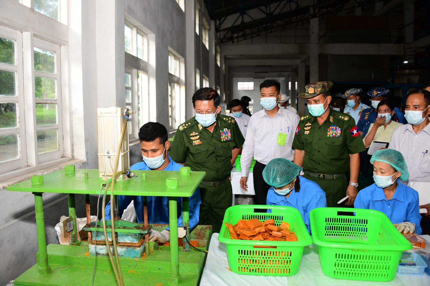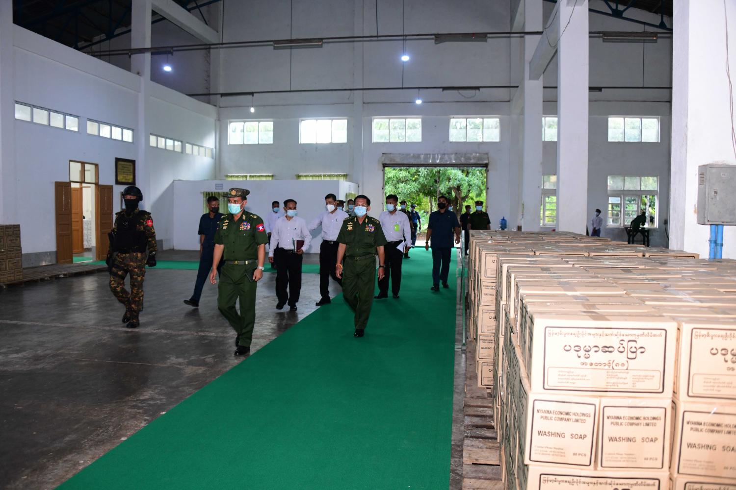 ထို့နောက် နိုင်ငံတော်စီမံအုပ်ချုပ်ရေးကောင်စီ ဥက္ကဋ္ဌ၊ တပ်မတော်ကာကွယ်ရေး ဦးစီးချုပ်နှင့် အဖွဲ့ဝင်များသည် စက်ရုံမှ ထုတ်လုပ်သည့် ဆပ်ပြာများနှင့် ဈေးကွက် အတွင်း အသုံးပြုလျက်ရှိသည့် ဆပ်ပြာခဲများအား ကြည့်ရှုကြပြီး စက်ရုံအတွင်း ဆပ်ပြာ ထုတ်လုပ်နေမှု အခြေအနေများအား လှည့်လည်ကြည့်ရှုစစ်ဆေးပြီး လိုအပ်သည်များမှာ ကြားခဲ့ကာ စက်ရုံဝန်ထမ်းများအတွက် ချီးမြှင့်ငွေများကို ပေးအပ်သည်။