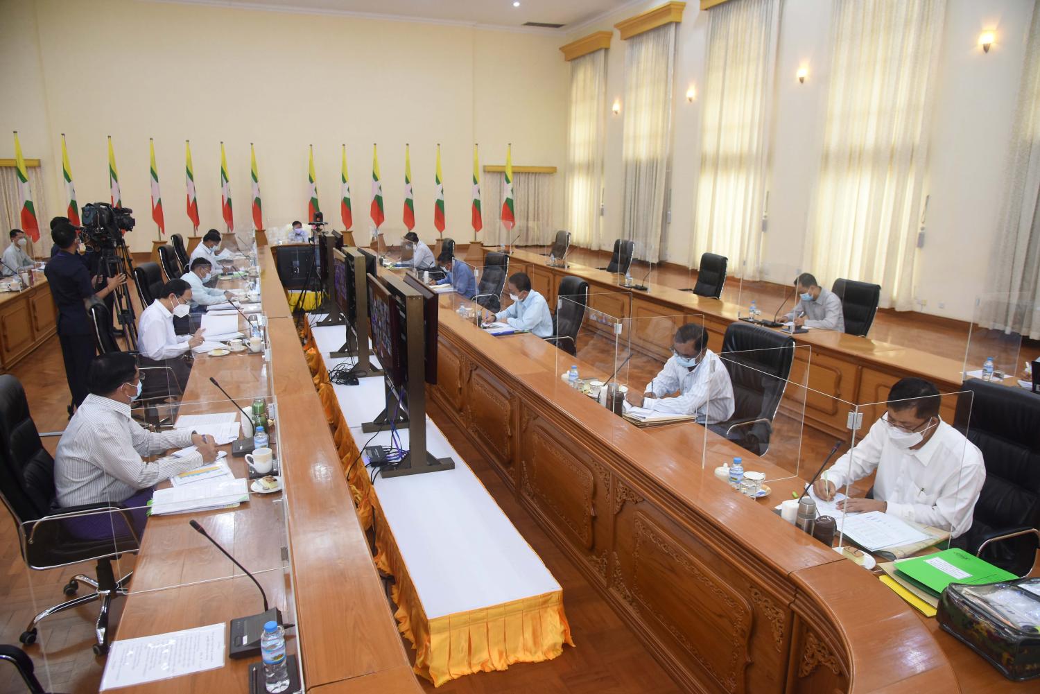 ယင်းနောက် နိုင်ငံတော်စီမံအုပ်ချုပ်ရေးကောင်စီဒုတိယဥက္ကဋ္ဌ ကောင်စီအဖွဲ့ဝင်များ၊ ပြည်ထောင်စုဝန်ကြီးများ၊ တပ်မတော်အရာရှိကြီးများနှင့် တက်ရောက်လာကြသူများ က ကမ္ဘာလုံးဆိုင်ရာ ကိုဗစ်-၁၉ ရောဂါကူးစက်ပြန့်ပွားမှုအခြေအနေများနှင့် မြန်မာ နိုင်ငံအတွင်း ကူးစက်ပြန့်ပွားမှုအခြေအနေ၊ Test Center များ တိုးချဲ့ဖွင့်လှစ်၍ ယနေ့မှစတင်ကာ လူစုလူဝေးဖြစ်ပွားမှုမရှိစေရေး စနစ်တကျ ကြပ်မတ်၍ စစ်ဆေး ဆောင်ရွက်ပေးသွားမည့် အခြေအနေ၊ ထွက်ပေါ်လာသည့် စစ်ဆေးချက်အဖြေများ အပေါ်မူတည်၍ သက်ဆိုင်ရာ Center အသီးသီးသို့ လူနာတင် ယာဉ်များနှင့် ပို့ဆောင် နိုင်ရေးစီမံဆောင်ရွက်ထားရှိမှု အခြေအနေ၊ စစ်ဆေးမှုများ ပိုမိုပြုလုပ်နိုင်ခြင်းကြောင့် အတည်ပြုလူနာများ ပိုမိုများပြားလာနိုင်ပြီး ၎င်းတို့အား ထားရှိရန်အတွက် Centerများ တိုးချဲ့တည်ဆောက်ခြင်း၊ အောက်ဆီဂျင် လိုအပ် ချက်ဖြစ်ပေါ်မှုမရှိစေရေး အတွက် ဆောက်ရွက်လျက်ရှိသည့်အခြေအနေ၊ ရောက်ရှိလာသည့်ကာကွယ်ဆေး များကို ယနေ့တွင် စတင်ထိုးနှံပေးနေမှု အခြေအနေနှင့် တိုင်းဒေသကြီးနှင့် ပြည်နယ်အသီးသီး သို့ မော်တော်ယာဉ်၊ ရဟတ်ယာဉ်၊ လေယာဉ်များဖြင့် ပို့ဆောင်နိုင်ရေး ဆောင်ရွက်ထားရှိသည့် အခြေအနေ၊ ကာကွယ်ဆေး ထိုးနှံရေးအတွက် နယ်ပယ် ၁၂ ခု သတ်မှတ်ထားပြီး နယ်ပယ်များအလိုက် ဦးစားပေး ထိုးနှံနိုင်ရေး ဆောင်ရွက်ထားရှိသည့်အခြေအနေ၊ ကာကွယ်ဆေး ထိုးနှံရန်အတွက် SOP များ ရေးဆွဲ၍ စနစ်တကျထိုးနှံရေး၊ မှတ်တမ်းတင်ရေး ဆောင်ရွက်ထားရှိသည့် အခြေအနေ၊ ကိုဗစ်- ၁၉ ရောဂါ ကာကွယ်၊ ထိန်းချုပ်၊ ကုသရေးအတွက် ဆေးဝါးများ၊ အောက်ဆီဂျင်များနှင့် အထောက်အကူပြုဆေးပစ္စည်းများကို အဆင်ပြေ ချောမွေ့စွာ တင်သွင်းနိုင်ရေးအတွက် ဆောင်ရွက်ထားရှိသည့် အခြေအနေ၊ ဆက်လက်၍ ကုန်းကြောင်း၊ ရေကြောင်း၊ လေကြောင်းမှတစ်ဆင့် ထပ်မံဝင်ရောက်လာမည့် အခြေ အနေ၊ အများပြည်သူ ရုံးပိတ်ရက်ကာလအတွင်း ဘဏ်များ ဖွင့်လှစ်၍ ပင်စင်လစာ နှင့် လစာငွေများ လွယ်ကူချောမွေ့စွာထုတ်ပေးနိုင်ရေး ဆောင်ရွက်ပေးနေသည့် အခြေ အနေ၊ ယနေ့မှစ၍ Stock Exchange ရောင်းချမှုအား Online မှတစ်ဆင့် ဆောင်ရွက် နေသည့် အခြေအနေ၊ ပြည်သူလူထုအား ကိုဗစ်-၁၉ ရောဂါဖြစ်ပွားမှုနှင့် ပတ်သက်၍ သတင်းများထုတ်လွှင့်မှု၊ အသိပညာပေးအစီအစဉ်များကို တိုင်းရင်းသား ဘာသာများ ဖြင့်ပါ ကျယ်ပြန့်စွာဆောင်ရွက်နေမှုအခြေအနေ၊ ဆိပ်ကမ်းအသီးသီးတွင် ထုတ်ယူရန် ကျန်ရှိသည့် ဆေးဝါး များနှင့်ပတ်သက်၍ အမြန်ဆုံးလာရောက် ထုတ်ယူ၍ ပြည်သူလူထု အတွင်းသို့ ဈေးနှုန်းသက်သာစွာဖြင့် ဖြန့်ဝေပေးနိုင်ရေး ဆောင်ရွက်သွားမည့်အခြေ အနေများကို အကျယ်တဝင့် ရှင်းလင်းတင်ပြကြသည်။