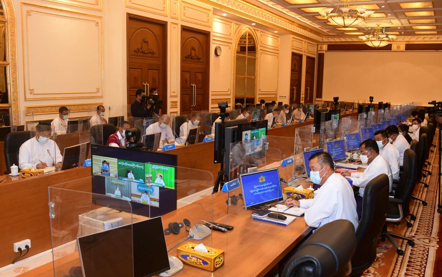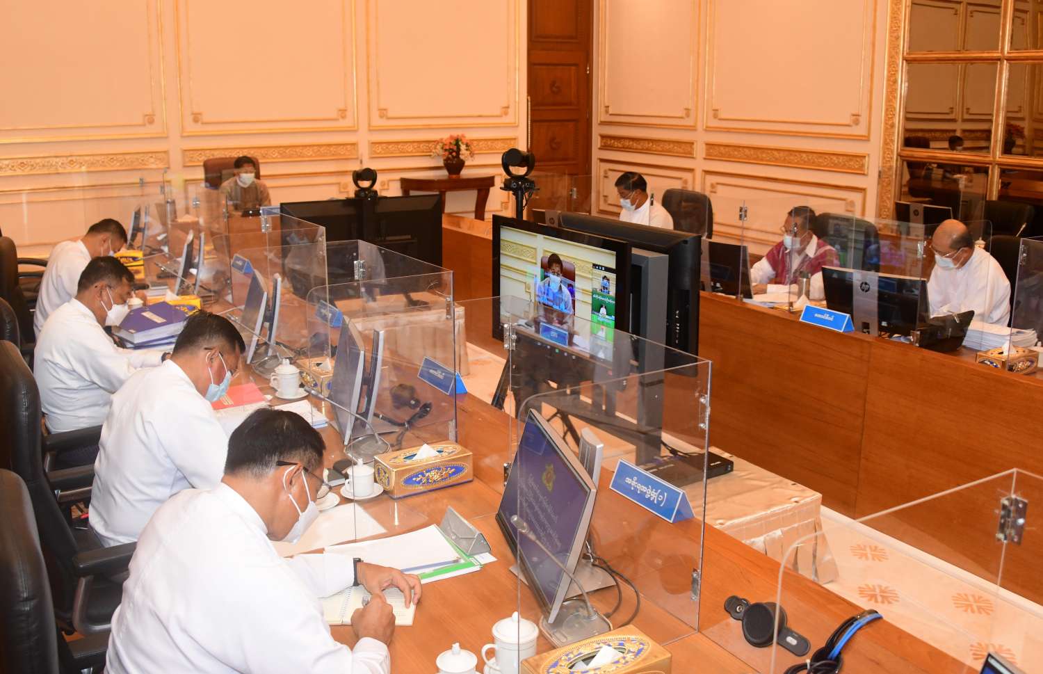 အစည်းအဝေးသို့ နိုင်ငံတော်စီမံအုပ်ချုပ်ရေးကောင်စီဝင်များ ဖြစ်ကြသည့် ဗိုလ်ချုပ်ကြီး တင်အောင်စန်း၊ ဗိုလ်ချုပ်ကြီး မောင်မောင်ကျော်၊ မန်းငြိမ်းမောင်၊ Jeng Phang နော်တောင်၊ ဒုတိယဗိုလ်ချုပ်ကြီး စိုးထွဋ်၊ ကောင်စီတွဲဖက်အတွင်းရေးမှူး ဒုတိယဗိုလ်ချုပ်ကြီး ရဲဝင်းဦး၊ ပြည်ထောင်စုဝန်ကြီးများဖြစ်ကြသည့် ဒုတိယဗိုလ်ချုပ်ကြီး ရာပြည့်၊ ဒုတိယဗိုလ်ချုပ်ကြီး ထွန်းထွန်းနောင်၊ ဒေါက်တာဒေါ်သီတာဦး၊ ဦးမောင်မောင်အုန်း၊ ဦးကိုကို၊ ဦခင်မောင်ရီ၊ ဦခင်ရီ၊ ဦးမြင့်ကြိုင်၊ ဒေါက်တာ သက်ခိုင်ဝင်း၊ ဒေါက်တာ သက်သက်ခိုင်၊ ဒုတိယဝန်ကြီးများ တက်ရောက်ကြပြီး စစ်ကိုင်းတိုင်းဒေသကြီးအစိုးရအဖွဲ့ ဝန်ကြီးချုပ် ဦးမြတ်ကျော်၊ မွန်ပြည်နယ်အစိုးရအဖွဲ့ ဝန်ကြီးချုပ် ဦးဇော်လင်းထွန်း၊ ရခိုင်ပြည်နယ် အစိုးရအဖွဲ့ဝန်ကြီးချုပ် ဒေါက်တာ အောင်ကျော်မင်းနှင့် ရှမ်းပြည်နယ်အစိုးရအဖွဲ့ ဝန်ကြီးချုပ် ဒေါက်တာကျော်ထွန်းတို့က Video Conferencing ဖြင့် တက်ရောက်ကြသည်။