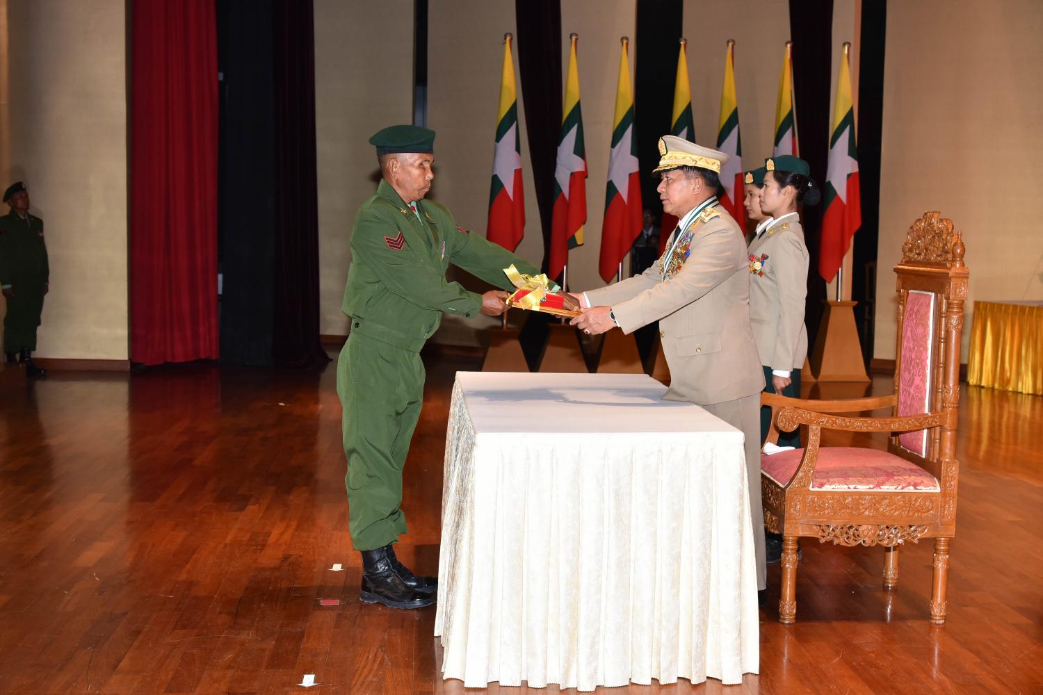ယင်းနောက် တပ်မတော်ကာကွယ်ရေးဦးစီးချုပ် ဗိုလ်ချုပ်မှူးကြီး မဟာသရေစည်သူ မင်းအောင်လှိုင်က သူရဲကောင်းမှတ်တမ်းဝင် တံဆိပ်ရရှိသူ ဒုတိယဗိုလ်မှူးကြီး ၂ ဦး၊ ဗိုလ်မှူး ၃ ဦး၊ ဗိုလ်ကြီး ၂ ဦး၊ တပ်ကြပ်ကြီး ၂ ဦးနှင့် အမွေခံ ၆ ဦးတို့အားလည်းကောင်း၊ တပ်မတော်ကာ ကွယ်ရေးဦးစီးချုပ်၏ သူရဲကောင်းလက်မှတ် ရရှိသူများဖြစ်ကြသည့် ဗိုလ်မှူးကြီး ၂ ဦးနှင့် ဗိုလ်မှူး ၁ ဦးတို့အား လည်းကောင်း၊ တပ်မတော်ကာကွယ်ရေး ဦးစီးချုပ်၏ ဂုဏ်ထူးဆောင်လက်မှတ်ရရှိသူ ဗိုလ်မှူးကြီး ၁ ဦး၊ ဗိုလ်ကြီး ၄ ဦးနှင့် အမွေခံ ၁ ဦးတို့အားလည်းကောင်း သူရဲကောင်း မှတ်တမ်းဝင် တံဆိပ်နှင့်လက်မှတ်များကို ပေးအပ်ချီးမြှင့်သည်။