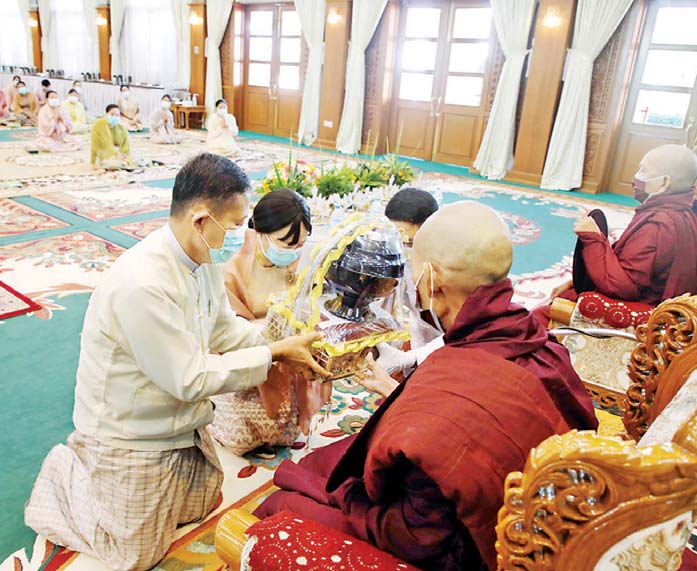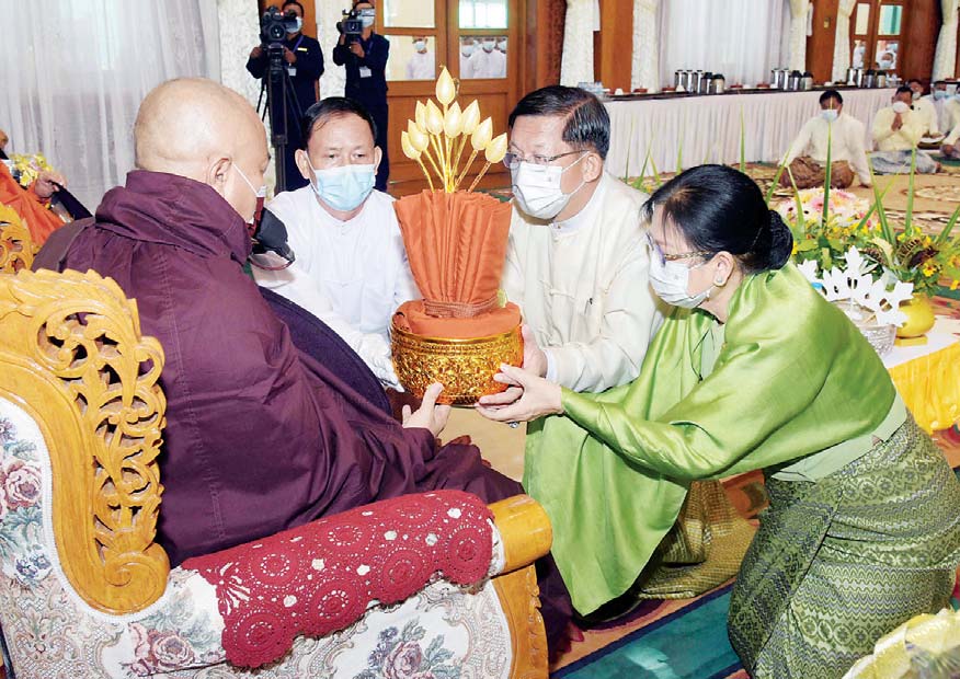 ဦးစွာ နိုင်ငံတော်စီမံအုပ်ချုပ်ရေးကောင်စီဥက္ကဋ္ဌ တပ်မတော်ကာကွယ်ရေးဦးစီးချုပ်၊ ဇနီးနှင့် ဧည့်ပရိသတ်များသည် ဘုန်းတော်ကြီး ကျောင်းအသီးသီးသို့ လှူဒါန်းရန် ခင်းကျင်းပြင်ဆင်ထား သည့် ကထိန်လျာသင်္ကန်း၊ လှူဖွယ်ပစ္စည်းများနှင့် ပဒေသာပင် များအား လှည့်လည်ကြည့်ရှုကြသည်။ ထို့နောက် နိုင်ငံတော်စီမံအုပ်ချုပ်ရေးကောင်စီဥက္ကဋ္ဌ တပ်မတော်ကာကွယ်ရေး ဦးစီးချုပ်နှင့် ဇနီးတို့သည် အနော်ရထာခန်းမအတွင်းရှိ ဗုဒ္ဓရုပ်ပွားတော်မြတ်အား ဖူးမြော်ကြည်ညို၍ မြသပိတ်ဆွမ်းတော်နှင့် ပန်း၊ သောက်တော်ရေချမ်း၊ ဆီမီး၊ သစ်သီးတို့ကို ဆက်ကပ်လှူဒါန်းသည်။