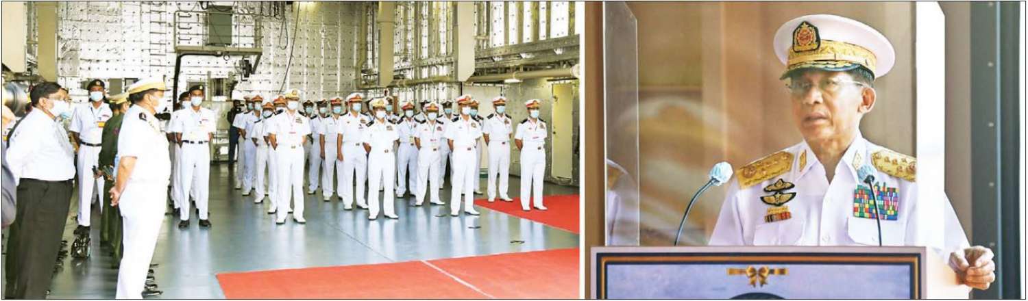 ကျန်းမာရေးနှင့်ပတ်သက်၍ တစ်ဆက်တည်း မှာကြားလိုသည်မှာ တစ်ကမ္ဘာလုံး ကြုံတွေ့နေရသည့် ကိုဗစ်-၁၉ ရောဂါ ကာကွယ်ထိန်းချုပ်ကုသရေးပင်ဖြစ်ကြောင်း၊ မိမိတို့နိုင်ငံ၌ ကိုဗစ်-၁၉ ရောဂါကို နိုင်ငံတော်အစိုးရ၊ တပ်မတော်၊ သက်ဆိုင်ရာ အဖွဲ့အစည်းများနှင့် ပြည်သူလူထုတို့လက်တွဲပြီး ကာကွယ်ထိန်းချုပ်ကုသရေး လုပ်ငန်းစဉ်များတွင် စုပေါင်းဆောင်ရွက်ခဲ့ကြသည့်အတွက် ကိုဗစ်-၁၉ ရောဂါ တတိယလှိုင်းကို ရင်ဆိုင်ကျော်လွှားနိုင်ခဲ့ပြီဖြစ်ကြောင်း၊ ထိုသို့ ဆောင်ရွက်ခဲ့ရာတွင် တပ်မတော်(ရေ) မှ တပ်ဖွဲ့ဝင်များအနေဖြင့် မြန်မာ့ကမ်းရိုးတန်း တစ်လျောက်နှင့် မြစ်ဝကျွန်းပေါ်ဒေသ များရှိ သွားလာရေး ခက်ခဲပြီး ရေလမ်းခရီးကိုသာ အားပြုနေထိုင်နေရသည့် အရပ် ဒေသမှ တိုင်းရင်းသား ပြည်သူများအတွက် ကာကွယ်ဆေး၊ ကုသဆေးနှင့် အောက်ဆီဂျင် အပါအဝင် အခြားလိုအပ်သည့် ပစ္စည်းများကို စစ်ရေယာဉ် များနှင့် သယ်ယူ ပို့ဆောင်ရေးတာဝန်များကို စွမ်းစွမ်းတမံဆောင်ရွက်ပေးနိုင်ခဲ့သည့် အတွက်လည်း အသိအမှတ်ပြု ချီးကျူးပါကြောင်း၊ ကိုဗစ်-၁၉ ရောဂါဖြစ်ပေါ်ခဲ့သည့် ကာလအတွင်း တပ်မတော်၏ ဆောင်ရွက်မှုများသည် မြန်မာ့သမိုင်းတွင် မှတ်ကျောက်တင်နိုင်မည့် ဆောင်ရွက်ချက်များပင်ဖြစ်ပြီး တပ်မတော်(ရေ)မှ အစိတ်အပိုင်းတစ်ခုအနေဖြင့် ပါဝင်ဆောင်ရွက်ခဲ့သည့်အတွက်လည်း ကျေးဇူးတင်ရှိပြီး မှတ်တမ်းတင်အပ်ပါကြောင်း၊ ကိုဗစ်-၁၉ ရောဂါသည် အရှင်းပျောက်ကင်းသွားမည့် ရောဂါမျိုး မဟုတ်သဖြင့် ထပ်မံ ကြုံတွေ့လာမည့် အခြေအနေများကိုလည်း ရင်ဆိုင်ကူညီနိုင်ရန် အသင့်ဖြစ်စေရေး ကြိုတင်ပြင်ဆင်ထားကြရန် မှာကြားလိုကြောင်း။