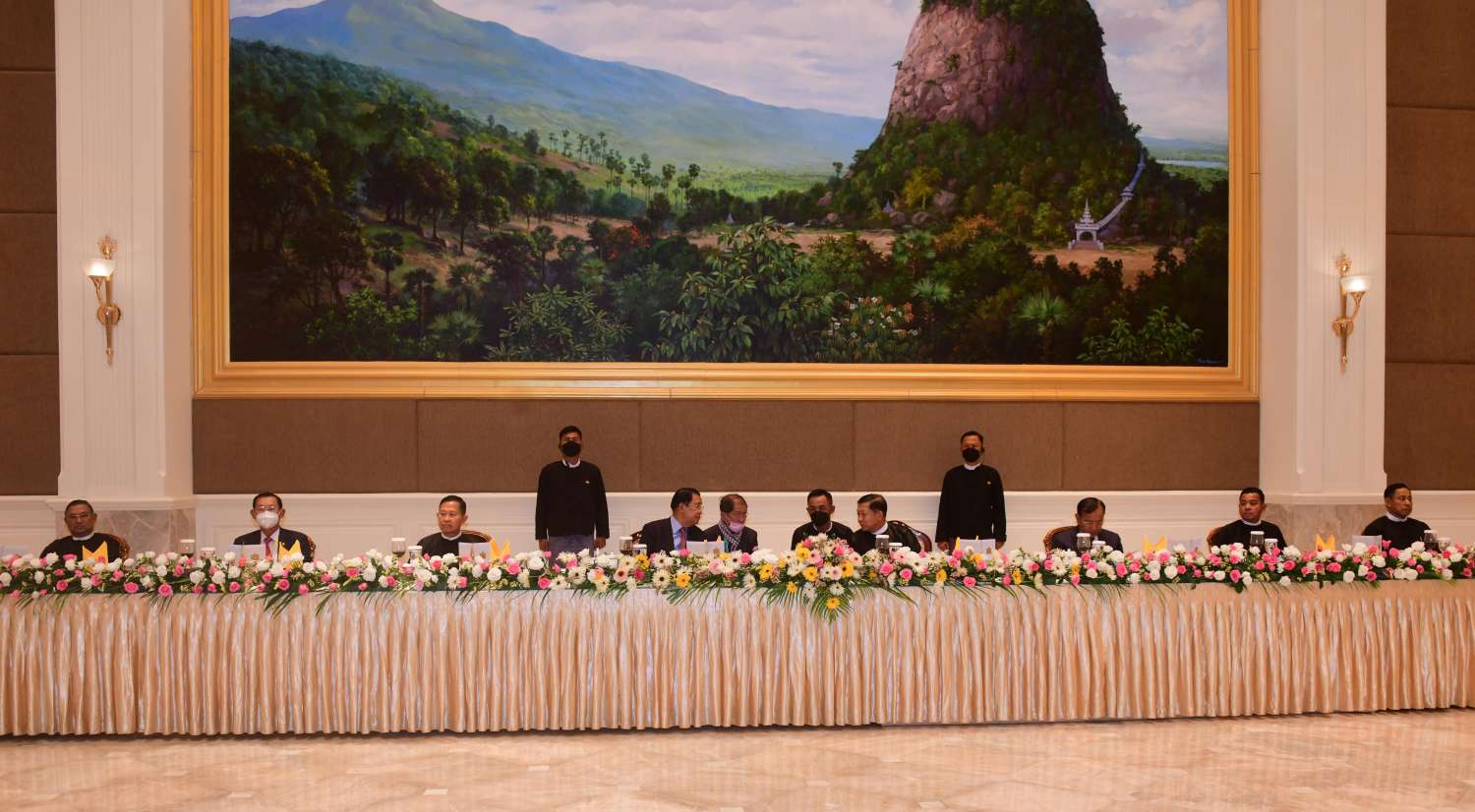 ညစာစားပွဲ အခမ်းအနားတွင် နိုင်ငံတော်စီမံအုပ်ချုပ်ရေးကောင်စီဥက္ကဋ္ဌ နိုင်ငံတော်ဝန်ကြီးချုပ် ဗိုလ်ချုပ်မှူးကြီး မင်းအောင်လှိုင်နှင့် ကမ္ဘောဒီးယားနိုင်ငံ ဝန်ကြီးချုပ် Samdech Akka Moha Sena Padei Techo HUN SEN တို့သည့် ဂုဏ်ပြုညစာစားပွဲသို့ တက်ရောက်လာကြ သူများနှင့်အတူ ညစာကိုအတူတကွ သုံးဆောင်ကြသည်။