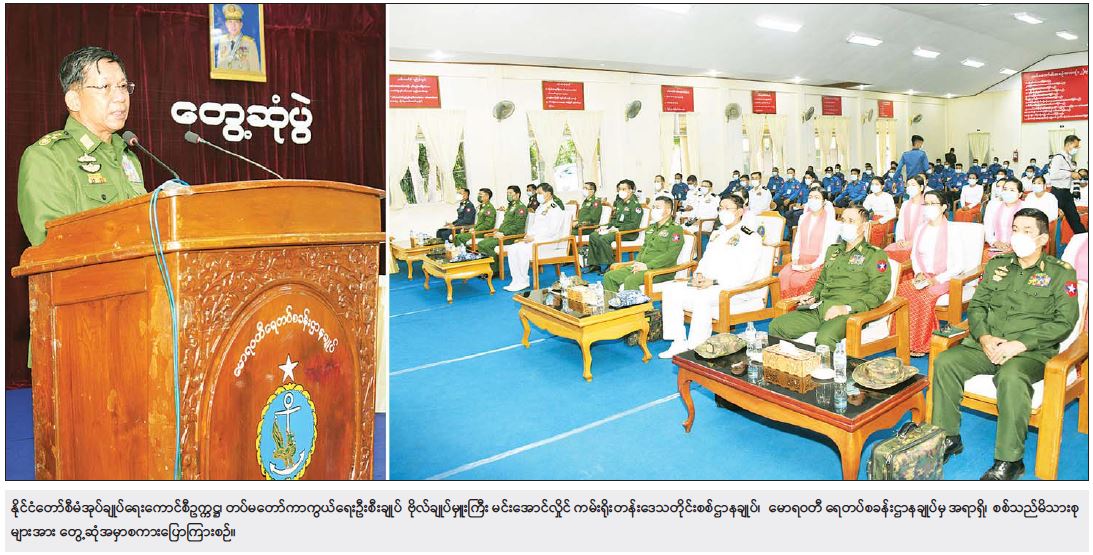 နိုင်ငံတော်စီမံအုပ်ချုပ်ရေးကောင်စီဥက္ကဋ္ဌ၊ တပ်မတော်ကာကွယ်ရေးဦးစီးချုပ် ဗိုလ်ချုပ်မှူးကြီး မင်းအောင်လှိုင်သည် ကာကွယ်ရေးဦးစီးချုပ် (ရေ) ဗိုလ်ချုပ်ကြီး မိုးအောင်၊ ကာကွယ်ရေး ဦးစီးချုပ်ရုံးမှ တပ်မတော်အရာရှိကြီးများ၊ ကမ်းရိုးတမ်းဒေသ တိုင်းစစ်ဌာနချုပ် တိုင်းမှူး ဗိုလ်ချုပ် စောသန်းလှိုင်နှင့် တာဝန်ရှိသူများ လိုက်ပါ၍ ယနေ့ညနေပိုင်းတွင် ကမ်းရိုးတမ်းဒေသ တိုင်းစစ်ဌာနချုပ်၊ မောရဝတီရေတပ်စခန်းဌာနချုပ်မှ အရာရှိ၊ စစ်သည် မိသားစုများအား သွားရောက် တွေ့ဆုံအမှာစကားပြောကြားသည်။