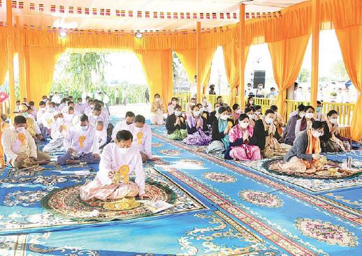 ဦးစွာ နိုင်ငံတော်စီမံအုပ်ချုပ်ရေးကောင်စီဥက္ကဋ္ဌ နိုင်ငံတော်ဝန်ကြီးချုပ်၊ ဇနီးနှင့် အခမ်းအနား တက်ရောက်လာကြသူများက မြို့နယ်သံဃနာယက အဖွဲ့ဥက္ကဋ္ဌ၊ စလင်းမြို့ မဟာဝိသုတာရာမ စိန်ပန်းကျောင်းတိုက်ပဓာနနာယက မဟာဂန္ထဝါစကပဏ္ဍိတ၊ ဓမ္မကထိက ဗဟုဇနဟိတဓရ ဘဒ္ဒန္တ ကုမာရထံမှ ကိုးပါးသီလ ခံယူဆောက်တည်ကြပြီး ဥပါသကာများက ပရိတ်ပန်း၊ ပရိတ်ရေ၊ ပရိတ်ချည်၊ ပရိတ်သဲများကို သံဃာတော်များထံ ဆက်ကပ်သည်။ ထို့နောက် သံဃာတော်အရှင်သူမြတ်တို့ ရွတ်ပွားချီးမြှင့် တော်မူကြသည့် ပရိတ်တရားတော်များကို နာယူကြည်ညိုကြသည်။