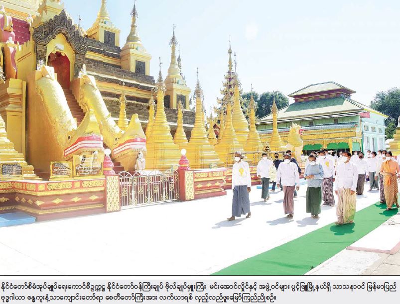 ထို့နောက် နိုင်ငံတော်စီမံအုပ်ချုပ်ရေး ကောင်စီဥက္ကဋ္ဌ နိုင်ငံတော်ဝန်ကြီးချုပ်နှင့် အဖွဲ့ဝင်များသည် ပွင့်ဖြူမြို့နယ်ရှိ သာသနာဝင် မြန်မာပြည် ဗုဒ္ဓဂါယာ စန္ဓကူးနံ့သာ ကျောင်းတော်ရာ စေတီတော်သို့ သွားရောက်ဖူးမြော်ကြည်ညိုပြီး ပန်း၊ ရေချမ်း၊ ဆီမီး ကပ်လှူပူဇော်သည်။ ယင်းနောက် စေတီတော်ကြီးအတွက် ဘက်စုံအလှူငွေများ ပေးအပ်လှူဒါန်းရာ ဂေါပကအဖွဲ့ဝင်များက လက်ခံရယူပြီး ဓမ္မလက်ဆောင် ပြန်လည်ပေးအပ်သည်။ ဆက်လက်ပြီး နိုင်ငံတော်စီမံအုပ်ချုပ်ရေး ကောင်စီဥက္ကဋ္ဌ နိုင်ငံတော်ဝန်ကြီးချုပ်၊ ဇနီးနှင့် အဖွဲ့ဝင်များသည် ဘုရားအကျိုးတော်ဆောင်ချုပ် ဆရာတော် အဂ္ဂမဟာ သဒ္ဓမ္မ ဇောတိကဓဇ ဘဒ္ဒန္တ ဓမ္မာစာရအား ဖူးမြော်ကြည်ညိုပြီး သာသနာရေးဆိုင်ရာများနှင့် ကျန်းမာရေးဆိုင်ရာများ မေးမြန်းလျှောက်ထားကာ လှူဖွယ်ပစ္စည်းများ ဆက်ကပ်လှူဒါန်းသည်။ ထို့နောက် စေတီတော်ကြီးအား လက်ယာရစ်လှည့်လည် ဖူးမြော်ကြည်ညိုပြီး ရေရှည်တည်တံ့ခိုင်မြဲရေးအတွက် စနစ်တကျ ထိန်းသိမ်းဆောင်ရွက်ရန် လိုအပ်သည်များ ဆွေးနွေးမှာကြားခဲ့ကြောင်း သတင်းရရှိသည်။