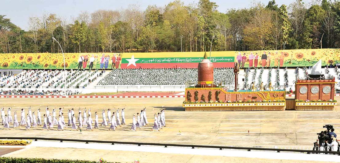 ဂုဏ်ပြုဖျော်ဖြေနေစဉ်အတွင်း နေပြည်တော်ကောင်စီနယ်မြေ ဇဗ္ဗူသီရိမြို့နယ်နှင့် ပျဉ်းမနား မြို့နယ်တို့ရှိ အခြေခံပညာကျောင်းများမှ ကျောင်းသား၊ ကျောင်းသူ (၁၁၀၀) တို့က ပြည်ထောင်စုနယ်မြေနှင့် တိုင်းဒေသကြီး၊ ပြည်နယ်အမည် စာလုံးများကို ညီညာလှပစွာ ပုံဖော်ပြသကြသည်။