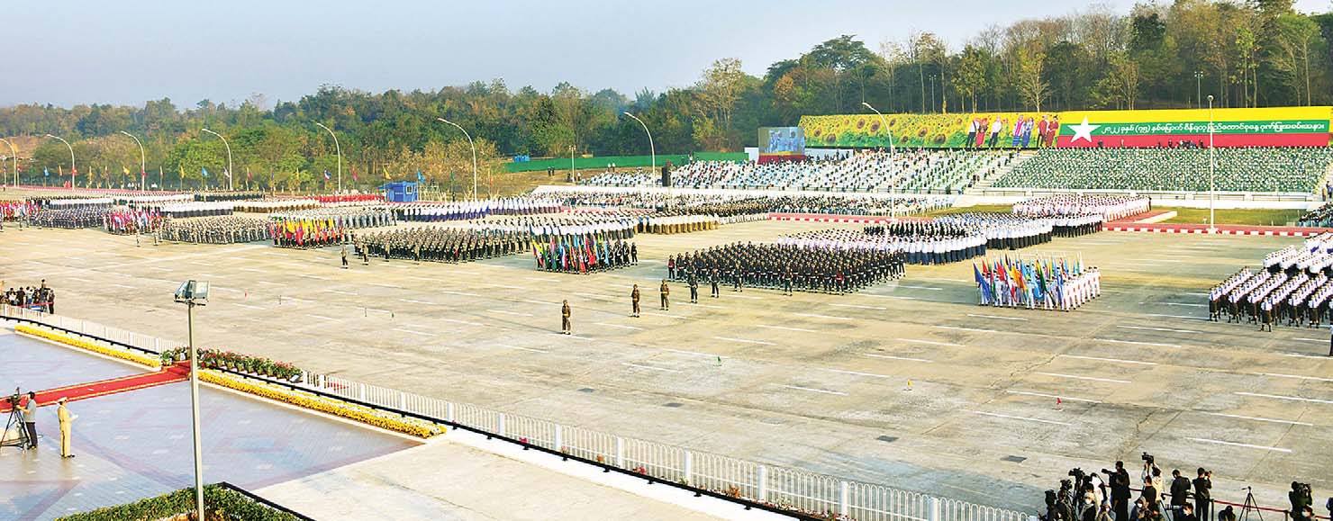 ဦးစွာ နိုင်ငံတော်စီမံအုပ်ချုပ်ရေးကောင်စီဥက္ကဋ္ဌ နိုင်ငံတော်ဝန်ကြီးချုပ်အား ချီတက်အလေးပြု ကြမည့် စစ်ကြောင်းတပ်ခွဲများသည် (၇၅) နှစ်မြောက်စိန်ရတု ပြည်ထောင်စုနေ့ ဂုဏ်ပြု အခမ်းအနားကျင်းပမည့် ဥပစာရင်ပြင်သို့ ချီတက်နေရာယူကြသည်။