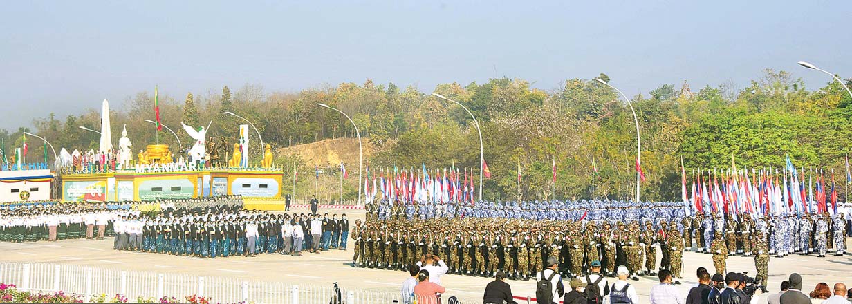 နံနက် (၇) နာရီခွဲတွင် နိုင်ငံတော်စီမံအုပ်ချုပ်ရေးကောင်စီဥက္ကဋ္ဌ နိုင်ငံတော် ဝန်ကြီးချုပ် ဗိုလ်ချုပ်မှူးကြီး မဟာသရေစည်သူ မင်းအောင်လှိုင် သည် ဂုဏ်ပြုအခမ်းအနားကျင်းပမည့် ဥပစာရင်ပြင်ရှိ အလေးပြုခံစင်မြင့်သို့ရောက်ရှိရာ အမြောက်တပ်ဖွဲ့က အမြောက်(၂၁)ချက် ပစ်ဖောက် ဂုဏ်ပြုပြီး စစ်ကြောင်းတပ်ခွဲများနှင့် အခမ်းအနားသို့ တက်ရောက်လာကြသူများက အလေးပြုကြသည်။