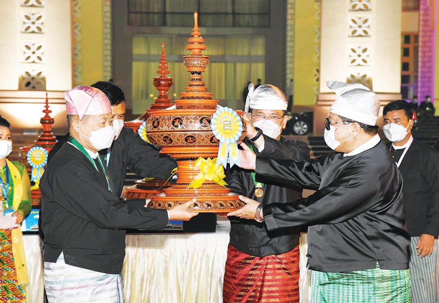 ယင်းနောက် နိုင်ငံတော်စီမံအုပ်ချုပ်ရေးကောင်စီဥက္ကဋ္ဌ နိုင်ငံတော်ဝန်ကြီးချုပ် ဗိုလ်ချုပ်မှူးကြီး မဟာသရေစည်သူ မင်းအောင်လှိုင်က ဂုဏ်ပြုယာဉ်ပထမဆုရရှိသည့် မကွေးတိုင်းဒေသကြီး အတွက် ဂုဏ်ပြုဆုနှင့်ဂုဏ်ပြုဆုငွေများကို တိုင်းဒေသကြီးဝန်ကြီးချုပ် ဦးတင့်လွင်ထံ လည်းကောင်း ပေးအပ်ချီးမြှင့်သည်။ ဆုချီးမြှင့်ပွဲအပြီးတွင် ၂၀၂၂ ခုနှစ် (၇၅)နှစ်မြောက် စိန်ရတုပြည်ထောင်စုနေ့ကို ဂုဏ်ပြုသောအားဖြင့် မီးရှူးမီးပန်းများ ပစ်ဖောက်ဂုဏ်ပြုသည်။