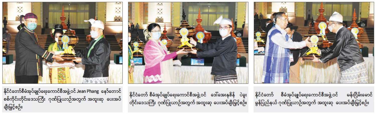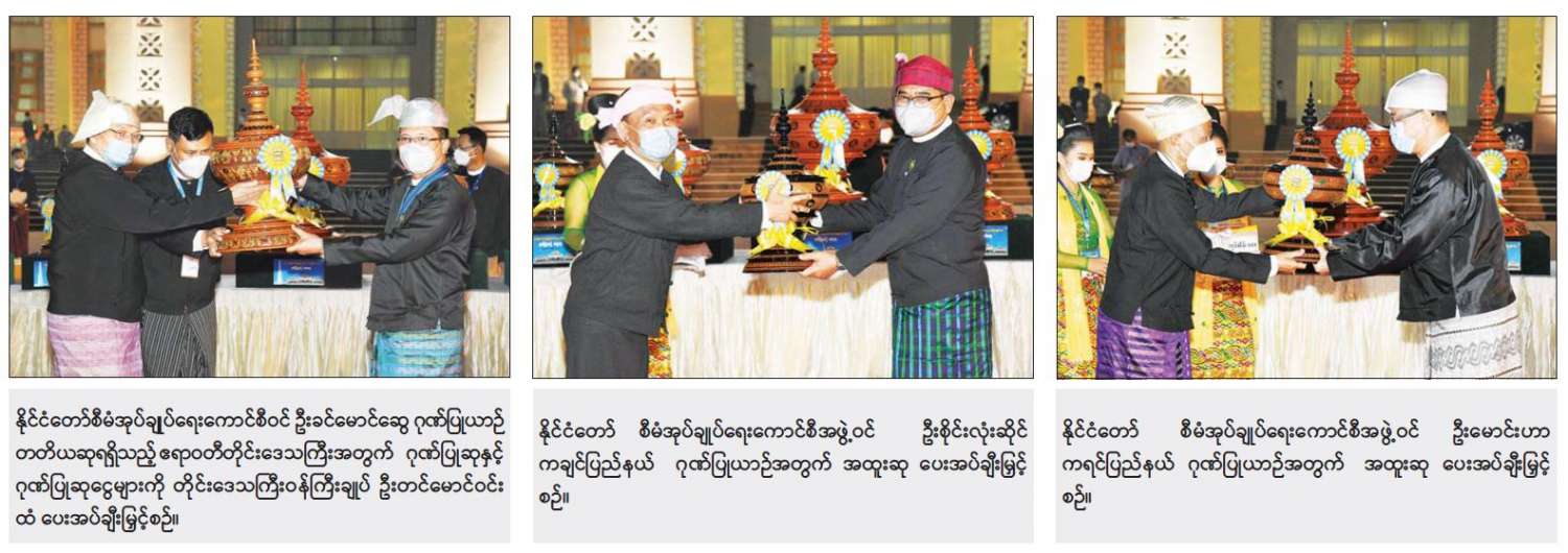 ဆက်လက်ပြီး နိုင်ငံတော်စီမံအုပ်ချုပ်ရေးကောင်စီဝင် ဦးခင်မောင်ဆွေက ဂုဏ်ပြုယာဉ် တတိယဆုရရှိသည့် ဧရာဝတီတိုင်းဒေသကြီးအတွက် ဂုဏ်ပြုဆုနှင့် ဂုဏ်ပြုဆုငွေများကို တိုင်းဒေသကြီးဝန်ကြီးချုပ် ဦးတင်မောင်ဝင်းထံလည်းကောင်း၊ နိုင်ငံတော်စီမံအုပ်ချုပ်ရေး ကောင်စီ ဒုတိယဥက္ကဋ္ဌ ဒုတိယဗိုလ်ချုပ်မှူးကြီး စိုးဝင်းက ဂုဏ်ပြုယာဉ် ဒုတိယဆုရရှိသည့် ရှမ်းပြည်နယ်အတွက် ဂုဏ်ပြုဆုနှင့် ဂုဏ်ပြုဆုငွေများကို ပြည်နယ်ဝန်ကြီးချုပ် ဒေါက်တာ ကျော်ထွန်း ထံလည်းကောင်း ပေးအပ်ချီးမြှင့်ကြသည်။