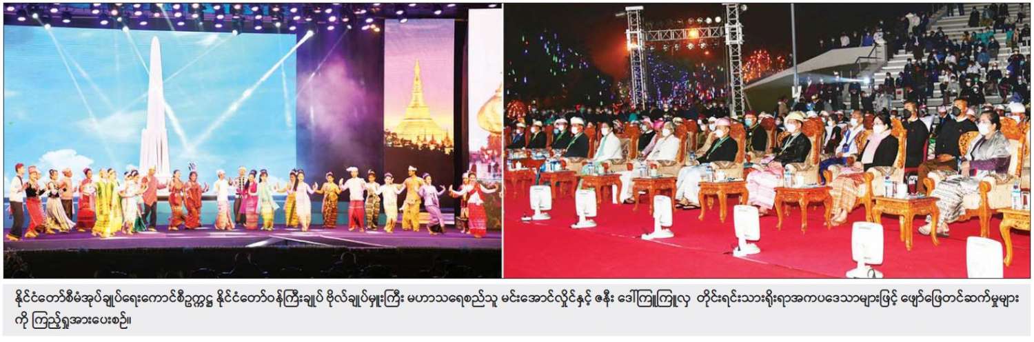 ပြည်ထောင်စုသမ္မတမြန်မာနိုင်ငံတော် နိုင်ငံတော်စီမံအုပ်ချုပ်ရေးကောင်စီဥက္ကဋ္ဌ နိုင်ငံတော် ဝန်ကြီးချုပ် ဗိုလ်ချုပ်မှူးကြီး မဟာသရေစည်သူ မင်းအောင်လှိုင်နှင့်ဇနီး ဒေါ်ကြူကြူလှတို့က တည်ခင်းဧည့်ခံသည့် ၂၀၂၂ ခုနှစ် (၇၅) နှစ်မြောက် စိန်ရတုပြည်ထောင်စုနေ့ အထိမ်းအမှတ် ဂုဏ်ပြုညစာစားပွဲ အခမ်းအနားကို ယနေ့ညပိုင်းတွင် နေပြည်တော်ရှိ မြို့တော်ခန်းမ ဥပစာရင်ပြင်၌ ကျင်းပသည်။