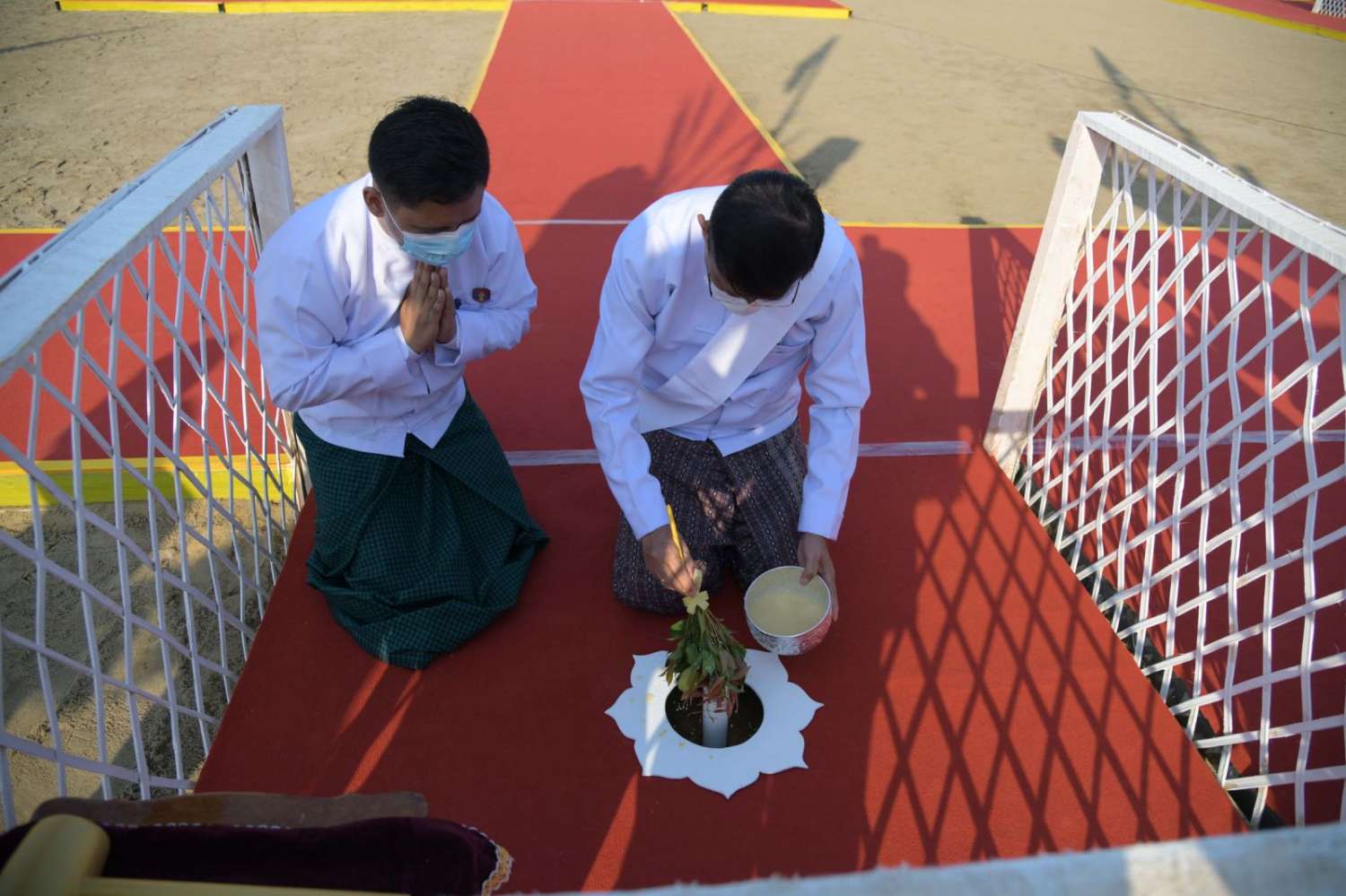 ဆက်လက်၍ ပန္နက်တော်စိုက်ထူပူဇော်သည့် ရှေးထုံးစဉ်လာ ကျမ်းဂန်တော်လာ အစဉ်အလာမြတ်များနှင့်အညီ နေရာယူကြပြီး ကောင်စီဒုတိယဥက္ကဋ္ဌ ဒုတိယဝန်ကြီးချုပ် ဒုတိယဗိုလ်ချုပ်မှူးကြီး စိုးဝင်း၊ ကောင်စီဝင်များဖြစ်ကြသည့် ဗိုလ်ချုပ်ကြီး မြထွန်းဦး၊ ဗိုလ်ချုပ်ကြီး တင်အောင်စန်း၊ မန်းငြိမ်းမောင်၊ ဒုတိယဗိုလ်ချုပ်ကြီး စိုးထွဋ်၊ ဒုတိယဗိုလ်ချုပ်ကြီး ရာပြည့်၊ ပြည်ထောင်စုဝန်ကြီးများ ဖြစ်ကြသည့် ဦးဝဏ္ဏမောင်လွင်နှင့် ဦးကိုကိုတို့က သတ်မှတ်နေရာအသီးသီး၌ ရတနာပန္နက်တော်များကို စိုက်ထူ ပူဇော်ပြီး ပရိတ်နံ့သာရည် ပက်ဖျန်းပူဇော်ကြသည်။
