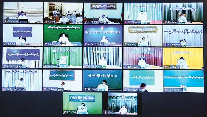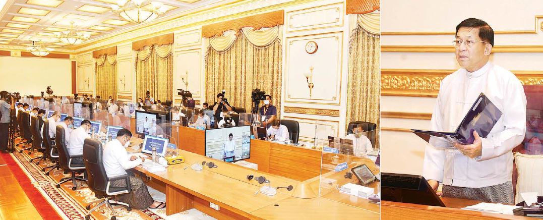 အမျိုးသားစီမံကိန်းရည်မှန်းချက်များ အပြည့်အဝအကောင်အထည်ဖော်ရာတွင် နိုင်ငံ၏ လူမှုစီးပွားအခြေအနေ များသာမက ပြည်ပသက်ရောက်မှု၊ ကုန်သွယ်ဘက် မိတ်ဆွေနိုင်ငံများ၏ စီးပွားရေးနှင့် နိုင်ငံရေးတည်ငြိမ်မှုတို့ကို ထည့်သွင်းစဉ်းစား ဆောင်ရွက်ရန်သတိပြုကြရန် လိုအပ်သကဲ့သို့ FDI ပိုမိုစီးဝင်စေရေး၊ ကုန်သွယ်မှု တိုးမြှင့်စေရေးအပါအဝင် မိတ်ဘက်နိုင်ငံများ နှင့် ဆက်ဆံမှုပြုရာတွင် ဥပဒေ၊ စည်းမျည်း၊ စည်းကမ်းခိုင်မာ အားကောင်းစေရေးနှင့် လုံခြုံတည်ငြိမ်ရေးသည်လည်း အရေးပါသည့် အဓိကအကျုံးဝင်သော အချက်ဖြစ် သည်ကို ဂရုပြုဆောင်ရွက်ကြရန် လိုအပ်ကြောင်း၊ အထက်ပါအချက်များ ဆောင်ရွက်နိုင်ရေး ယနေ့အချိန် အတွက် အထူးအရေးကြီးသည့် အချက်သည် ကမ္ဘာလုံးဆိုင်ရာ ကိုဗစ်-၁၉ ကူးစက်မြန် ကပ်ရောဂါ ဘေးဆိုးကြီး၏ ရိုက်ခတ်မှုအန္တရာယ်မှ လျင်မြန်စွာလွန်မြောက်စေရန်၊ ကိုဗစ်ကပ်ရောဂါ နှင့်အတူ ယှဉ်တွဲ လုပ်ငန်းဆောင် ရွက်နိုင်စေရန်အတွက်လည်း နိုင်ငံတော်အစိုးရ အနေဖြင့် ကိုဗစ်-၁၉ ကပ်ရောဂါ ကာကွယ်ဆေးထိုးနှံခြင်းလုပ်ငန်းကို အရှိန်အဟုန်ဖြင့် ဆောင်ရွက် လျက်ရှိရာ ပြည်တွင်း၌ Ready to Fill စနစ်ဖြင့် စတင်ထုတ်လုပ်နိုင် ပြီဖြစ်သကဲ့သို့ ၂၀၂၂ ခုနှစ်ဧပြီလကုန်အပြီး တစ်နိုင်ငံလုံး ရာနှုန်းပြည့် ကာကွယ်ဆေး ထိုးနှံပြီးစီးရေးကိုလည်း ရည်မှန်းချက်ထားလျက် အရှိန်အဟုန်ဖြင့် ဆောင်ရွက်လျက်ရှိရာ ဝန်ကြီးဌာနများ၊ တိုင်းဒေသကြီးနှင့် ပြည်နယ်အစိုးရအဖွဲ့များကလည်း ရာနှုန်းပြည့် ကာကွယ်ဆေးထိုးနှံ ပြီးစီးရေး ဝိုင်းဝန်းပူးပေါင်းဆောင်ရွက်ပေးကြရန် တိုက်တွန်းပြောကြားသည်။