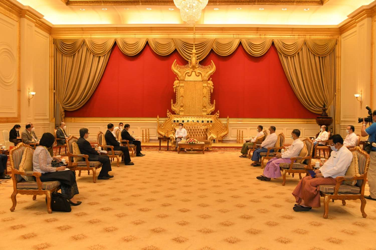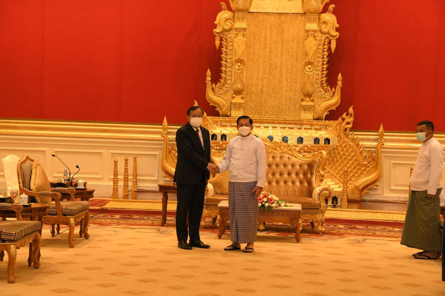 နိုင်ငံတော်စီမံအုပ်ချုပ်ရေးကောင်စီဥက္ကဋ္ဌ နိုင်ငံတော်ဝန်ကြီးချုပ် ဗိုလ်ချုပ်မှူးကြီးမင်းအောင်လှိုင် အာဆီယံအလှည့်ကျဥက္ကဋ္ဌ၏ မြန်မာနိုင်ငံဆိုင်ရာအထူးကိုယ်စားလှယ် ကမ္ဘောဒီးယားနိုင်ငံ ဒုတိယဝန်ကြီးချုပ် H.E. Mr. Prak Sokhonn နှင့် အာဆီယံ အတွင်းရေးမှူးချုပ် H.E. Dato Lim Jock Hoi တို့အား ယနေ့နံနက် ၁၀ နာရီခွဲတွင် နေပြည်တော်ရှိ နိုင်ငံတော်စီမံအုပ်ချုပ်ရေးကောင်စီဥက္ကဋ္ဌရုံး၊ သံတမန်ဆောင်ဧည့်ခန်းမ၌ လက်ခံတွေ့ဆုံသည်။