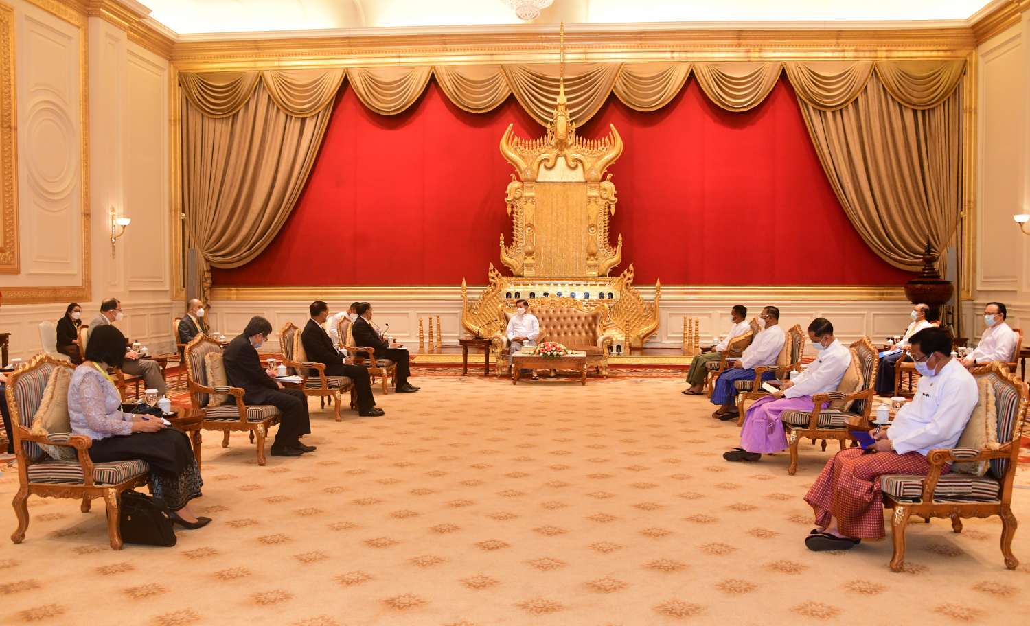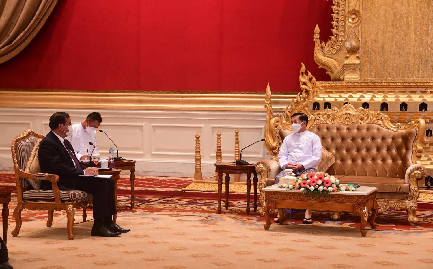 နိုင်ငံတော်စီမံအုပ်ချုပ်ရေးကောင်စီဥက္ကဋ္ဌ နိုင်ငံတော်ဝန်ကြီးချုပ် ဗိုလ်ချုပ်မှူးကြီး မင်းအောင်လှိုင် အာဆီယံအလှည့်ကျဥက္ကဋ္ဌ၏ မြန်မာနိုင်ငံဆိုင်ရာအထူးကိုယ်စားလှယ် ကမ္ဘောဒီးယားနိုင်ငံ ဒုတိယဝန်ကြီးချုပ်၊ နိုင်ငံခြားရေးနှင့် အပြည်ပြည်ဆိုင်ရာ ပူးပေါင်း ဆောင်ရွက်ရေးဝန်ကြီး H.E. Mr. Prak Sokhonn နှင့် အာဆီယံအတွင်းရေးမှူးချုပ် H.E. Dato Lim Jock Hoi တို့အား ယနေ့နံနက် ၁၀ နာရီခွဲတွင် နေပြည်တော်ရှိ နိုင်ငံတော်စီမံ အုပ်ချုပ်ရေးကောင်စီဥက္ကဋ္ဌရုံး၊ သံတမန်ဆောင်ဧည့်ခန်းမ၌ လက်ခံတွေ့ဆုံသည်။