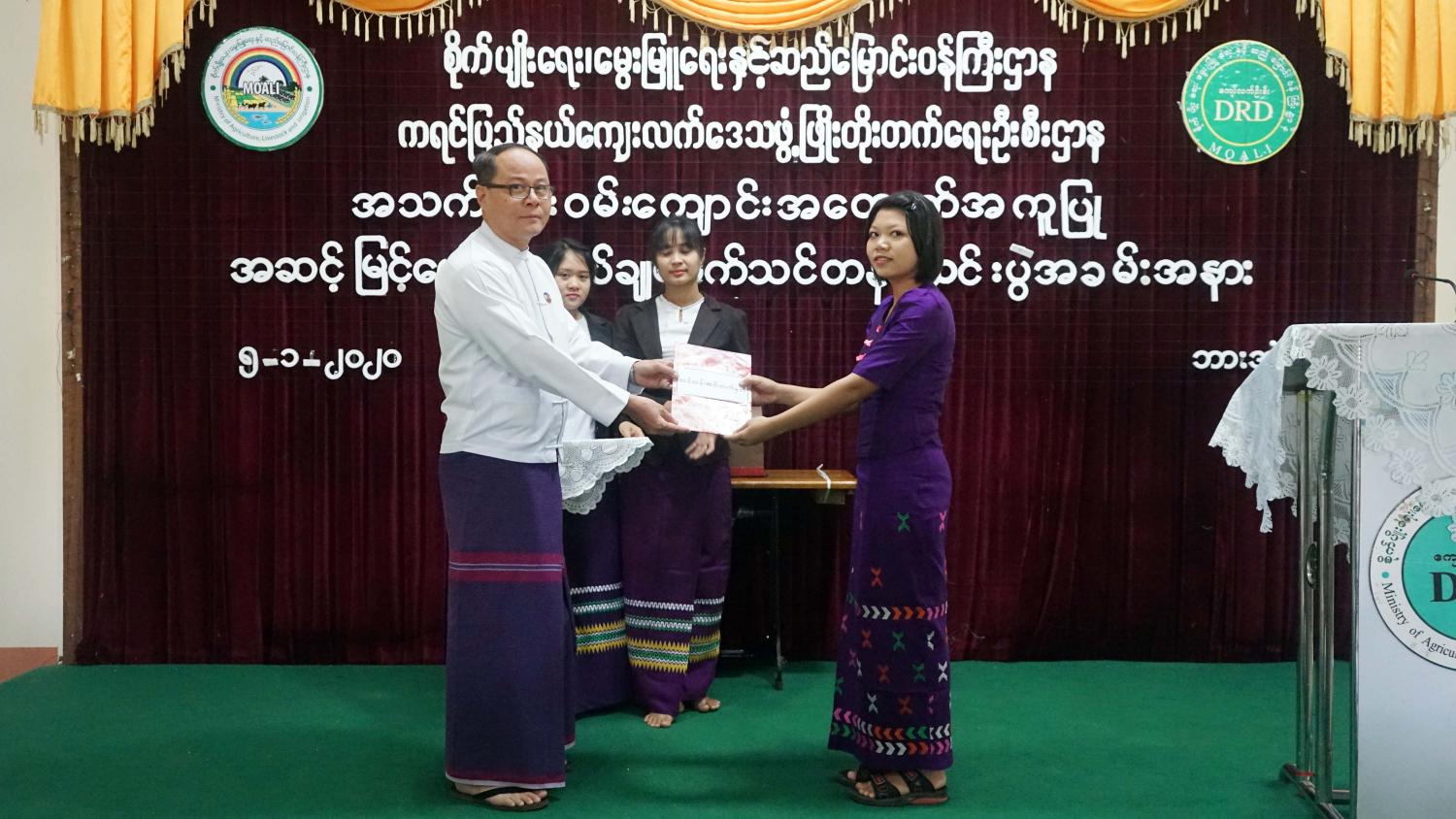 ရှေးဦးစွာ ကရင်ပြည်နယ်အစိုးရအဖွဲ့၊ ပြည်နယ်ဝန်ကြီးချုပ်ဒေါ်နန်းခင်ထွေးမြင့်က သင်တန်းဆင်းအမှာစကားပြောကြားပြီး သင်တန်းဆင်းထူးချွန်ဆုရရှိသော ကြာအင်းဆိပ်ကြီးမြို့နယ်၊ ဖါးပြကျေးရွာမှ နော်ဖေါဘူးဘူးနှင့် ဘားအံမြို့နယ် အီဟယ်လေး ကျေးရွာမှ မချစ်ချစ်တို့အား အပ်ချုပ်စက်တစ်စုံစီနှင့် ဂုဏ်ပြုဆုများပေးအပ်ချီးမြှင့်ကာ ပြည်နယ်စိုက်ပျိုးရေး၊ မွေးမြူရေးနှင့်ဆည်မြောင်းဝန်ကြီး ဦးစောမြင့်ဦးက သင်တန်းဆင်းအောင်လက်မှတ်များ ပေးအပ်ချီးမြှင့်သည်။