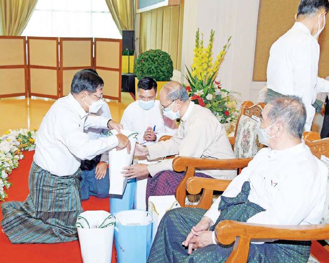 ယင်းနောက် နိုင်ငံတော်စီမံအုပ်ချုပ်ရေးကောင်စီဥက္ကဋ္ဌ နိုင်ငံတော်စီမံအုပ်ချုပ်ရေး ကောင်စီဥက္ကဋ္ဌ တပ်မတော်ကာကွယ်ရေး ဦးစီးချုပ်နှင့်ဇနီး၊ ကောင်စီဒုတိယဥက္ကဋ္ဌ ဒုတိယတပ်မတော်ကာကွယ်ရေး ဦးစီးချုပ် ကာကွယ်ရေးဦးစီးချုပ်နှင့်ဇနီး၊ တပ်မတော် အရာရှိကြီးများက အငြိမ်းစားတပ်မတော် အရာရှိကြီးများထံ ဂါရဝပြုလက်ဆောင်ပစ္စည်းများကို ကိုယ်တိုင်ကိုယ်ကျ ရိုသေစွာ ဂါရဝပြု ပေးအပ်ကြသည်။