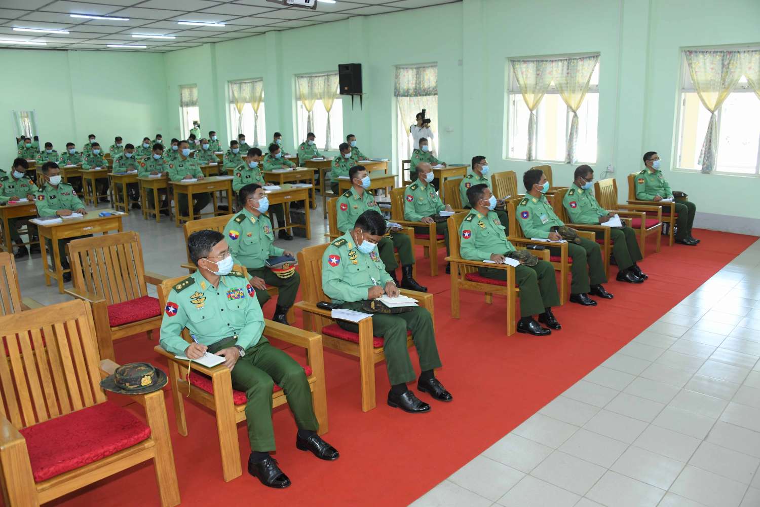ထိုသို့ လေ့ကျင့်ဆောင်ရွက်ပေးရာတွင် ရုပ်ပိုင်း၊ စိတ်ပိုင်းဆိုင်ရာ ကျန်းမာကြံ့ခိုင်အောင် လေ့ကျင့် ပေးရန်လိုကြောင်း၊ အာဟာရပြည့်မီအောင် တွက်ချက်၍ ပြည့်ပြည့် ဝဝကျွေးရမည်ဖြစ်ပြီး ထိုသို့ ဆောင်ရွက်ပေးမှသာလျင် စစ်သည်တစ်ဦးချင်း ကိုယ်ခန္ဓာကြံ့ခိုင်ဖွံ့ဖြိုးလာမည်ဖြစ်ကာ စစ်သားကောင်း တစ်ယောက်ပီသသည့် ရုပ်ပိုင်းဆိုင်ရာကို တည်ဆောင်ပေးနိုင်မည်ဖြစ်ကြောင်း၊ ရုပ်ပိုင်းဆိုင်ရာ ကောင်းမွန်မှသာလျင် စိတ်ဓာတ် ပိုင်းလည်းကောင်းမွန်လာမည်ဖြစ်ကြောင်း၊ သင်တန်းသားများ၏ စိတ်ပိုင်းဆိုင်ရာကိုလည်း အားပေးမြှင့်တင်၍ လေ့ကျင့်ဆောင်ရွက်ပေးသွားရန် လိုကြောင်း၊ သင်တန်းသား တစ်ဦးချင်းစီ၏ လုပ်ဆောင်နိုင်မှု စွမ်းရည်ကို နည်းပြများအနေဖြင့် သိရှိနေရမည်ဖြစ်ပြီး မှန်မှန်ကန်ကန်ဖြင့် လေ့ကျင့်ဆောင်ရွက်ပေးနိုင်ရမည် ဖြစ်ကြောင်း၊ အဆင့်နှင့်လျော်ညီသည့် အတွေး အခေါ်ပိုင်းကို တိုးတက်ဖွံ့ဖြိုးအောင် သင်ကြားလေ့ကျင့်ပေး နိုင်ရမည်ဖြစ်ကြောင်း၊ လေ့ကျင့်ရေးမှသည် အရည်အသွေး ပြည့်ဝကောင်းမွန်သည့် အရာရှိ၊ စစ်သည်များကို မွေးထုတ်ပေးနိုင်မည်ဖြစ်သဖြင့် ကျောင်းများအလိုက် လေ့ကျင့်ရေးပိုင်းဆိုင်ရာများကို စနစ်တကျနှင့် ဖိဖိစီးစီး ဆောင်ရွက်ကြရန် လိုကြောင်း ဖြင့်မှာကြားသည်။ ပြင်ဦးလွင်တပ်နယ်ရှိ တက္ကသိုလ်၊ လေ့ကျင့်ရေးသင်တန်းကျောင်းများ အလိုက် လေ့ကျင့်ရေး အကောင်အထည်ဖော် ဆောင်ရွက်နိုင်မှုများနှင့် အထွေထွေလိုအပ်ချက်များ တင်ပြထို့နောက် စစ်တက္ကသိုလ်၊ တပ်မတော်နည်းပညာတက္ကသိုလ်၊ တပ်မတော် အုပ်ချုပ်မှုကျောင်း တို့အပါအဝင် ပြင်ဦးလွင်တပ်နယ်အတွင်းရှိ လေ့ကျင့်ရေး သင်တန်းကျောင်းများမှ ကျောင်းအုပ်ကြီး များက သက်ဆိုင်ရာ တက္ကသိုလ်၊ လေ့ကျင့် ရေးကျောင်းများအလိုက် သမိုင်းအကျဉ်း၊ လေ့ကျင့်ရေး ဆောင်ရွက်ပေးနေမှု အခြေအနေများ၊ တပ်မတော်အကြီးအကဲများ၏ လမ်းညွှန်ချက်များအပေါ် အကောင်အထည် ဖော်ဆောင်ရွက်နိုင်မှု အခြေအနေများ၊ သင်တန်းသားများ၏ စိတ်ဓာတ် စည်းကမ်းကောင်းမွန်မှု၊ လေ့ကျင့်သင်ကြားနိုင်မှုတို့ကို ဆန်းစစ်သုံးသပ်ချက်များနှင့် တွေ့ရှိချက်များ၊ အထွေထွေ လိုအပ်ချက်များကို အသီးသီး ရှင်းလင်းတင်ပြကြသည်။