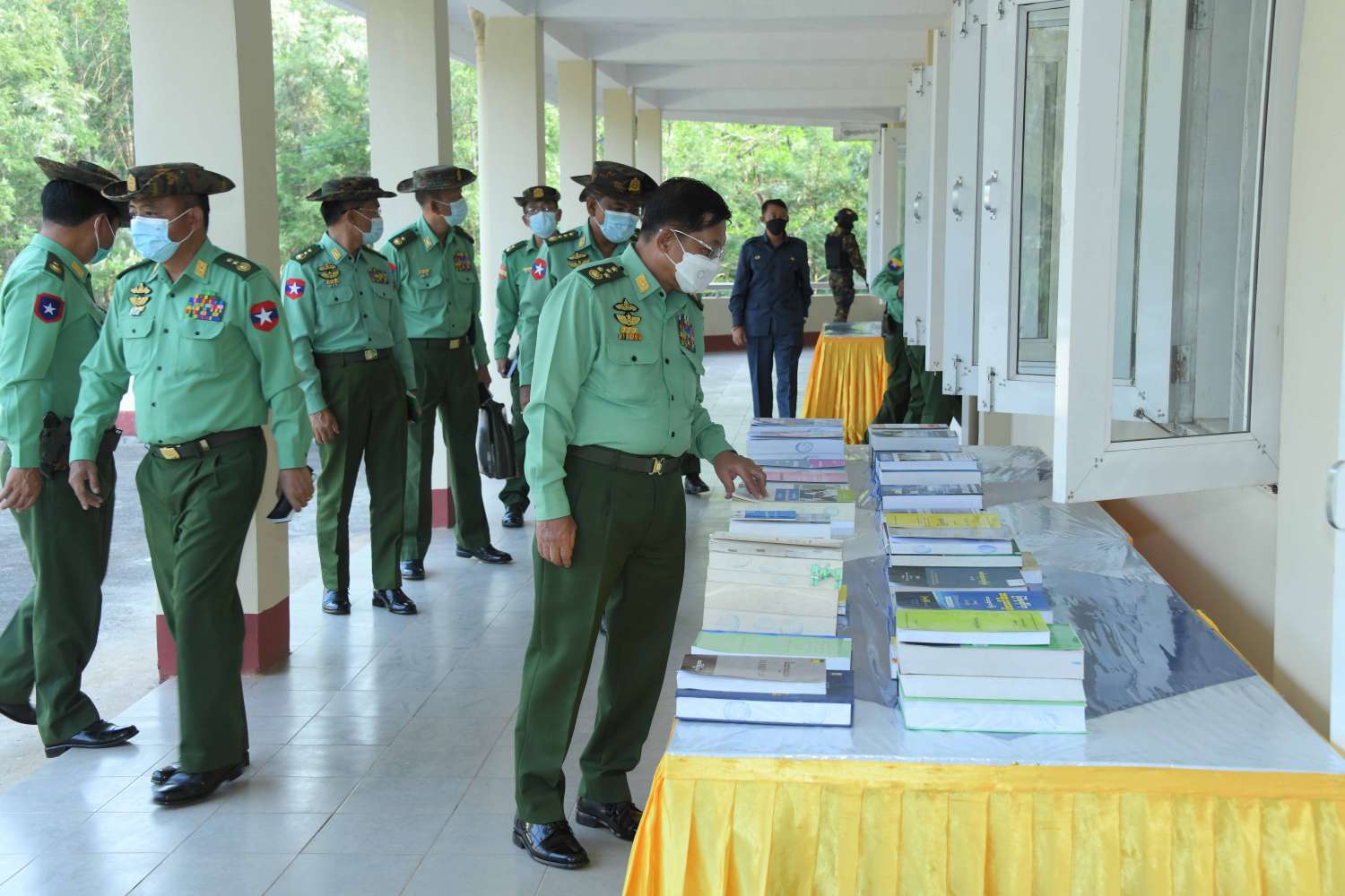 ထို့နောက် နိုင်ငံတော်စီမံအုပ်ချုပ်ရေးကောင်စီဥက္ကဋ္ဌ တပ်မတော်ကာကွယ်ရေး ဦးစီးချုပ် အဖွဲ့ဝင် များသည် သင်တန်းအထောက်အကူပြဆိုင်ရာ ဥပဒေစာအုပ်စာတမ်းများ၊ စာကြည့်တိုက်များကို ကြည့်ရှု စစ်ဆေးခဲ့ကြောင်း သတင်းရရှိသည်။