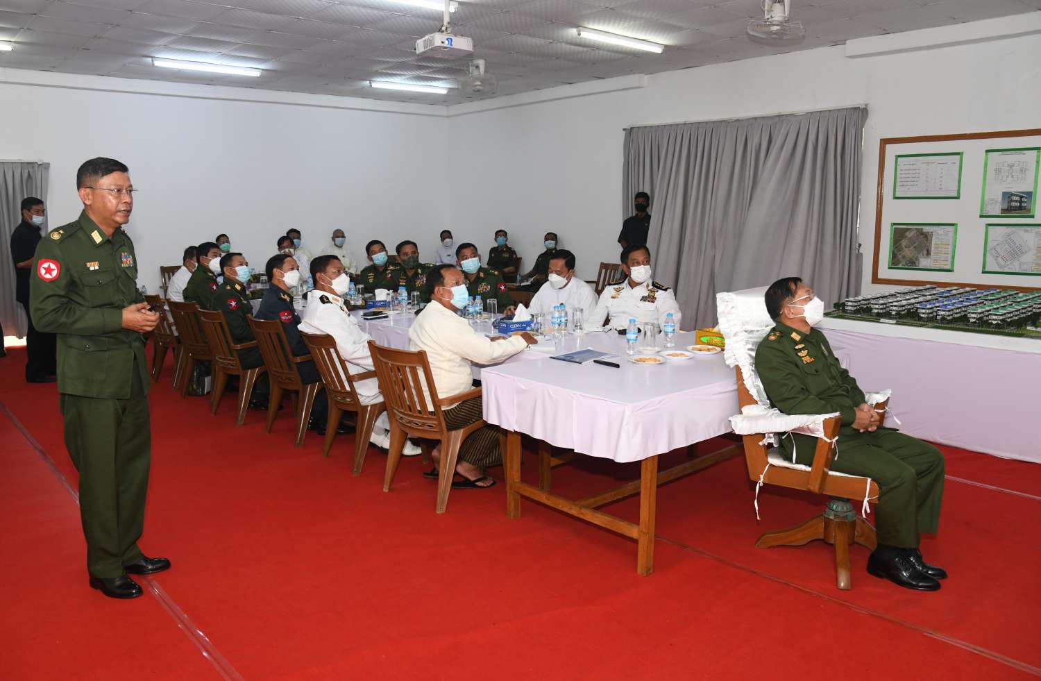 ဦးစွာ နိုင်ငံတော်စီမံအုပ်ချုပ်ရေးကောင်စီဥက္ကဋ္ဌ တပ်မတော်ကာကွယ်ရေးဦးစီးချုပ် အား ရှင်းလင်းဆောင်တွင် စစ်ထောက်ချုပ် ဒုတိယဗိုလ်ချုပ်ကြီး ကျော်စွာလင်း၊ တိုင်းမှူး ဗိုလ်ချုပ် ညွန့်ဝင်းဆွေ၊ စစ်အင်ဂျင်နီယာ ညွှန်ကြားရေးမှူးရုံး ညွှန်ကြားရေးမှူး ဗိုလ်ချုပ် မျိုးသန့်တို့က အိမ်ရာအတွင်း စစ်မှုထမ်းဟောင်းများနှင့် မိသားစုများကို နေရာချထားပေးမှု အခြေအနေများ၊ အိမ်ရာများ ထပ်မံတည်ဆောက်နေမှု၊ အရိပ်ရပင်များ စိုက်ပျိုးထားရှိမှု အခြေအနေများ၊ ရေ၊ မီး လိုအပ်ချက်များကို ဖြည့်ဆည်း ဆောင်ရွက်ပေးထားသည့် အခြေအနေများ၊ စစ်မှုထမ်းဟောင်း မိသားစုဝင်များ၏ နေထိုင်ရေးအတွက်သာမက စားရေး၊ နေရေးနှင့် အလုပ်အကိုင်ရရှိရေးတို့ အတွက် အဆင့်မြင့်ဥစားကြက်ခြံလုပ်ငန်း လည်ပတ်နေမှု အခြေအနေများ၊ အထည်ချုပ်စက်ရုံ လုပ်ငန်းလည်ပတ်နေမှု အခြေအနေများနှင့် အိမ်ရာအတွင်း သာရေး၊ နာရေးကိစ္စရပ်များ ဆောင်ရွက်နိုင်မည့် အခြေအနေများ၊ ကလေးကစားကွင်းနှင့် စာကြည့်တိုက် ထည့်သွင်း ဆောင်ရွက်ပေးထားသည့် အခြေအနေများကို အသီးသီး ရှင်းလင်းတင်ပြကြသည်။