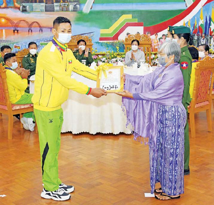 နိုင်ငံတော်စီမံအုပ်ချုပ်ရေးကောင်စီဒုတိယဥက္ကဋ္ဌ ဒုတိယတပ်မတော် ကာကွယ်ရေးဦးစီးချုပ်၊ ကာကွယ်ရေးဦးစီးချုပ် (ကြည်း)၏ဇနီးက ဝူရှူးအားကစားနည်း(တစ် ဦးချင်းပြိုင်ပွဲ)တွင် ကြေးတံဆိပ်ဆုရရှိခဲ့သည့် တပ်သားမျိုးမင်းထက်၊ ဗိုဗီနမ် အားကစားနည်း(တစ်ဦးချင်းပြိုင်ပွဲ)တွင် ကြေးတံဆိပ်ဆုရရှိခဲ့သည့် တပ်သားဝေသူလွင်၊ ပိုက်ကျော်ခြင်းအားကစားနည်း (အသင်းလိုက်) ပြိုင်ပွဲ(၂)ပွဲတွင် ကြေးတံဆိပ်ဆုရရှိခဲ့သည့် တပ်ကြပ်ကျော်ဇင်လတ်တို့ကို ဂုဏ်ပြုမှတ်တမ်းလွှာနှင့် ဂုဏ်ပြုဆုငွေများကိုလည်းကောင်း။