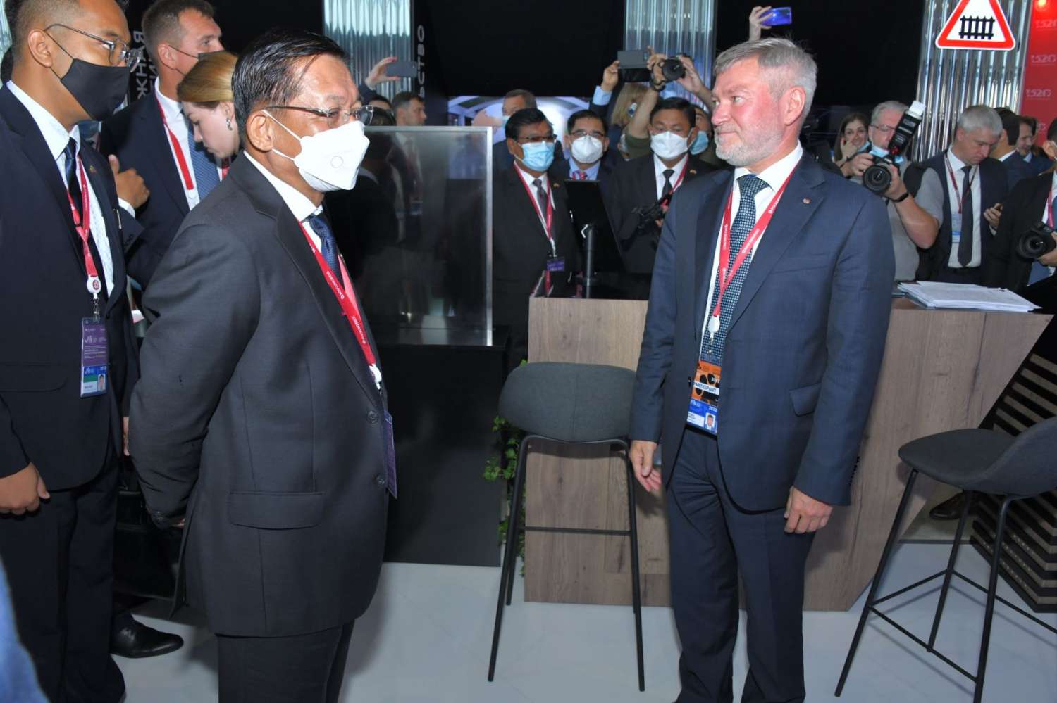 ထိုသို့ Eastern Economic Forum-2022 ရှိ Exhibition အတွင်း ခင်းကျင်းပြသထားသည့် ပြခန်းများအား ရုရှားဖက်ဒရေးရှင်းနိုင်ငံတွင် ရောက်ရှိနေသည့် နိုင်ငံတော်စီမံအုပ်ချုပ်ရေး ကောင်စီဥက္ကဋ္ဌ နိုင်ငံတော်ဝန်ကြီးချုပ် ဗိုလ်ချုပ်မှူးကြီး မင်းအောင်လှိုင် ဦးဆောင်သည့် အဖွဲ့ဝင်များက ယနေ့ဒေသစံတော်ချိန် နံနက်ပိုင်းတွင် သွားရောက်ကြည့်ရှု လေ့လာကြသည်။ ဦးစွာ နိုင်ငံတော်စီမံအုပ်ချုပ်ရေးကောင်စီဥက္ကဋ္ဌ နိုင်ငံတော်ဝန်ကြီးချုပ်နှင့် အဖွဲ့ဝင်များသည် RZD Russian Railways ကုမ္ပဏီပြခန်းသို့ ရောက်ရှိကြရာ ပြခန်းတာဝန်ခံများက မီးရထားလမ်းကြောင်း နည်းပညာများနှင့် ဝန်ဆောင်မှုပေးနိုင်သည့် အခြေအနေများကို ရှင်းလင်းတင်ပြရာ နိုင်ငံတော်စီမံအုပ်ချုပ်ရေး ကောင်စီဥက္ကဋ္ဌ နိုင်ငံတော်ဝန်ကြီးချုပ်က သိရှိလိုသည်များ ပြန်လည်မေးမြန်း ဆွေးနွေးသည်။