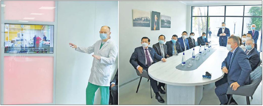 ထို့နောက် နိုင်ငံတော်စီမံအုပ်ချုပ်ရေးကောင်စီဥက္ကဋ္ဌ နိုင်ငံတော်ဝန်ကြီးချုပ်နှင့် အဖွဲ့ဝင်များသည် Irkutsk Regional Children's Clinical Hospital သို့ ရောက်ရှိကြရာ ဆေးရုံအကြီးအကဲ Mr.KOZok Yuri Andreevich နှင့် အဖွဲ့ဝင်များက ကြိုဆိုနှုတ်ဆက်ခဲ့ကြပြီး ဆေးရုံအတွင်း ကလေးသူငယ်များအား ကျန်းမာရေးစောင့်ရှောက်မှု ဆောင်ရွက်ပေးနိုင်မှု အခြေအနေများနှင့် ဆေးရုံကို ခုတင်-၄၀၀ ဆန့် အဆင့်မြှင့်တင်၍ နှစ်နှစ်အတွင်း ပြီးစီးအောင် ဆောင်ရွက်သွားမည့် အခြေအနေများနှင့် ပတ်သက်၍ Video presentation များ၊ VR နည်းပညာ အသုံးပြု၍ ဆေးရုံကြီး တည်ဆောက်ပြီးစီးပါက ဖြစ်ပေါ်လာမည့် အခြေအနေပုံရိပ်များကို အသေးစိတ် ရှင်းလင်းတင်ပြသည်။ ရှင်းလင်းတင်ပြမှုများနှင့် ပတ်သက်၍ နိုင်ငံတော်စီမံအုပ်ချုပ်ရေး ကောင်စီဥက္ကဋ္ဌ နိုင်ငံတော်ဝန်ကြီးချုပ်က ကျန်းမာရေးစောင့်ရှောက်မှုဆိုင်ရာများတွင် ပူးပေါင်းဆောင်ရွက်နိုင်မည့် အခြေအနေများနှင့် အခြားသိရှိလိုသည်များ ပြန်လည်မေးမြန်းဆွေးနွေးသည်။