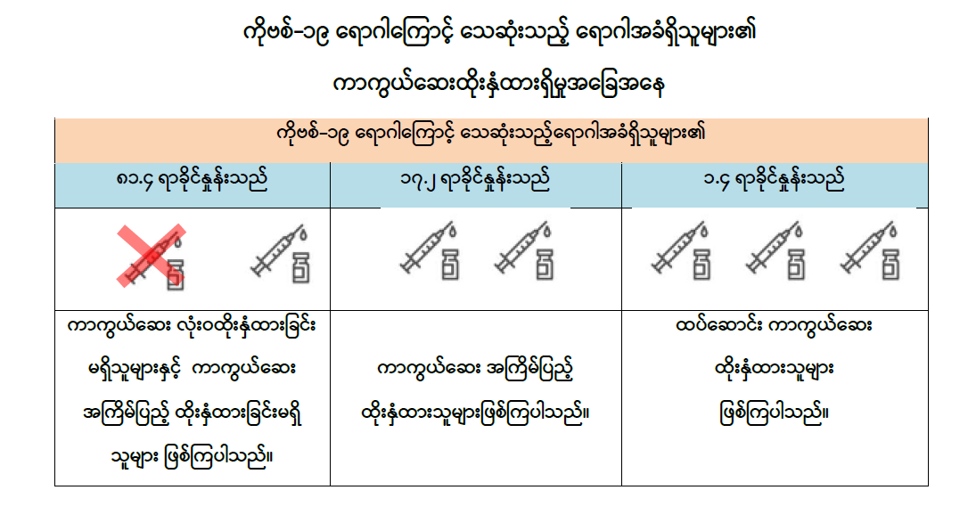 သို့ဖြစ်ပါ၍ ကိုဗစ်-၁၉ ရောဂါကူးစက်ခံရပါက အသက်အန္တရာယ် ဆုံးရှုံးနိုင်ခြေ ပိုမိုများပြားသည့် ဆီးချို၊ သွေးတိုး၊ နှလုံး၊ အသည်း၊ ကျောက်ကပ်၊ အဆုတ်၊ ကင်ဆာရောဂါ စသည့် နာတာရှည်ရောဂါအခံတစ်ခုခု ရှိသူများအနေဖြင့် ကိုဗစ်-၁၉ ရောဂါကာကွယ်ဆေးထိုးနှံမှုကို မပျက်မကွက် ခံယူကြပါရန်နှင့် ၎င်းတို့၏မိသားစုဝင်များ၊ မိတ်ဆွေများမှလည်း အဆိုပါ နာတာရှည်ရောဂါ အခံတစ်ခုခုရှိသူများအနေဖြင့် ကိုဗစ်-၁၉ ရောဂါကာကွယ်ဆေး ထိုးနှံမှုများကို အကြိမ်ပြည့် ထိုးနှံမှုခံယူရေးနှင့် ထပ်ဆောင်းကာကွယ်ဆေးများကို မပျက်မကွက် ထိုးနှံမှုခံယူနိုင်ရေးအတွက် နီးစပ်ရာ ကာကွယ်ဆေးထိုးစုရပ်များ၊ ကျန်းမာရေးဌာနများ၊ ရပ်ကွက်/ ကျေးရွာအုပ်ချုပ်ရေးမှူးရုံးများနှင့် မပျက်မကွက် ဆက်သွယ်ဆောင်ရွက်ကြပါရန် တိုက်တွန်းအပ်ပါသည်။