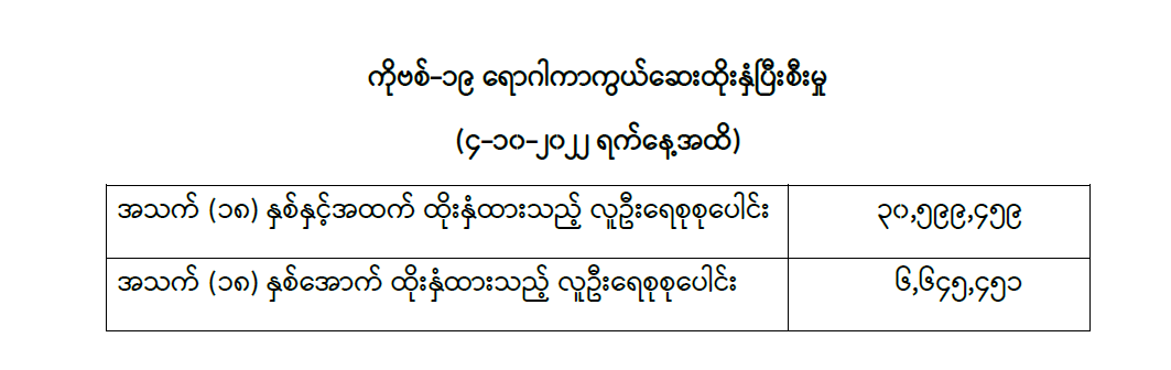 COVID-19 ရောဂါ ကာကွယ်ထိန်းချုပ်ရေးအတွက် တိုင်းဒေသကြီး/ ပြည်နယ်များတွင် COVID-19 ရောဂါကာကွယ်ဆေးကို ဦးတည်အုပ်စုများသတ်မှတ်၍ ထိုးနှံပေးလျက်ရှိရာ (၄-၁၀-၂၀၂၂) ရက်နေ့ အထိ အသက် (၁၈) နှစ်နှင့်အထက် လူဦးရေစုစုပေါင်း (၃၀,၅၉၉,၄၅၉) ဦးနှင့် အသက် (၁၈) နှစ်အောက် လူဦးရေစုစုပေါင်း (၆,၆၄၅,၄၅၁) ဦးတို့အား ထိုးနှံထားရှိပြီး ဖြစ်ပါသည်။