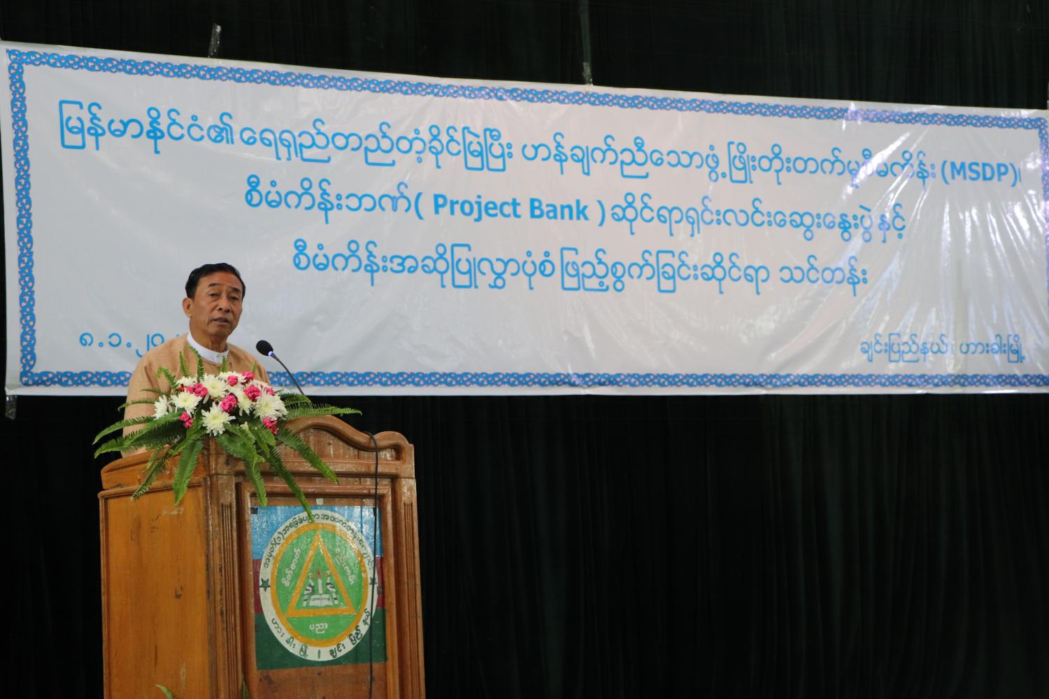 နိုင်ငံတော်စီးပွားရေးရာ ပေါင်းစပ်ညှိနှိုင်းရေး ကော်မတီရုံး၊ စီမံကိန်းရေးဆွဲရေးဦးစီးဌာန၊ မြန်မာဖွံ့ဖြိုးမှုအဖွဲ့အစည်းနှင့် Renaissance Institute နှင့် ချင်းပြည်နယ်အစိုးရအဖွဲ့တို့ ပူးပေါင်းကျင်းပသည့် မြန်မာနိုင်ငံ၏ ရေရှည်တည်တံ့ခိုင်မြဲပြီး ဟန်ချက်ညီသော ဖွံ့ဖြိုးတိုးတက်မှုစီမံကိန်း (MSDP) ၊ စီမံကိန်းဘဏ် (Project Bank) ဆိုင်ရာ ရှင်းလင်းဆွေးနွေးပွဲနှင့် စီမံကိန်းအဆိုပြုလွှာပုံစံ ဖြည့်စွက်ခြင်းဆိုင်ရာ ရှင်းလင်းပွဲ အခမ်းအနားကို ယမန်နေ့ မွန်းလွဲ ၁ နာရီအချိန်က ချင်းပြည်နယ်ဟားခါးမြို့ အမှတ်(၁) အခြေခံပညာအထက်တန်းကျောင်း ဗိုလ်တိုက်ချွန်းခန်းမ၌ ကျင်းပပြုလုပ်ရာ ချင်းပြည်နယ်ဝန်ကြီးချုပ် ဦးဆလိုင်းလျန်လွယ် တက်ရောက်၍ အမှာစကားပြောကြားသည်။