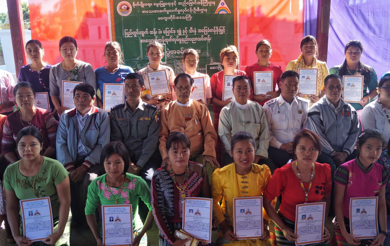 သင်တန်းဆင်းပွဲတွင်တွင် ပြည်သူ့လွှတ်တော်ကိုယ်စားလှယ် ဦးကျော်တင်နှင့် မကွေးတိုင်းဒေသကြီး၊ အသေးစား စက်မှုလက်မှုလက်မှုလုပ်ငန်းဦးစီးဌာနမှ လက်ထောက် အင်ဂျင်နီယာ ဒေါ်ခင်စိုးစိုးစံတို့က အမှာစကားပြောကြားကြပြီး သင်တန်းသူများကိုယ်စား သင်တန်းသူ ဒေါ်မြင့်မြင့်နွယ်က ကျေးဇူးတင်စကားပြောကြား၍ ပြည်သူ့လွှတ်တော်ကိုယ်စားလှယ် ဦးကျော်တင်နှင့် တာဝန်ရှိသူများက သင်တန်းဆင်း လက်မှတ်များ ပေးအပ်သည်။