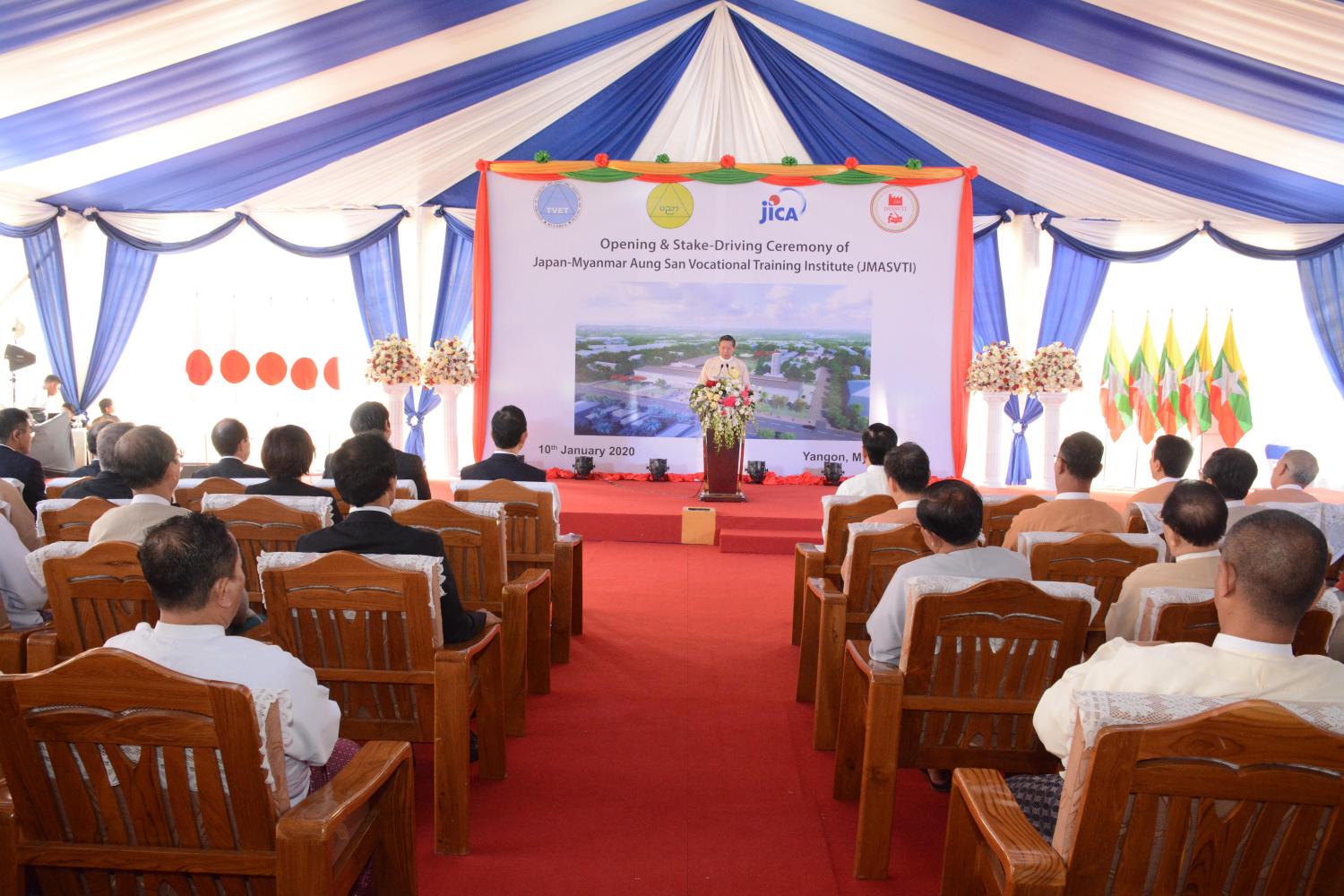 ပညာရေးဝန်ကြီးဌာန အနေဖြင့် အမျိုးသားပညာရေး မဟာဗျူဟာစီမံကိန်း (၂၀၁၆-၂၀၂၁)ကို ချမှတ် အကောင်အထည်ဖော် ဆောင်ရွက်လျက်ရှိရာ နည်းပညာနှင့် သက်မွေးပညာရေးကဏ္ဍ ပြုပြင်ပြောင်းလဲမှုကို အလေးထား ဆောင်ရွက်လျက်ရှိပါကြောင်း၊ နည်းပညာနှင့် သက်မွေးပညာရေးကို စိတ်ပါဝင်စား သင်ယူလိုသူများ လေ့လာသင်ယူခွင့်ရရှိရေး၊ အရည်အသွေး အာမခံမှုရှိရေးနှင့် ပိုမိုကောင်းမွန်သော နည်းပညာနှင့် သက်မွေးပညာရေး ဖြစ်ပေါ်လာစေရန် မဟာဗျုဟာများချမှတ်၍ အကောင်အထည်ဖော် ဆောင်ရွက်လျက် ရှိပါကြောင်း၊ လုပ်ငန်းခွင်လိုအပ်ချက်နှင့် ကိုက်ညီစေသည့် နည်းပညာနှင့် သက်မွေး ပညာရေး အစီအစဉ်များအနက် ယနေ့ဖွင့်လှစ်သည့် ဂျပန်-မြန်မာ အောင်ဆန်းသက်မွေးပညာ သင်တန်းကျောင်း စီမံကိန်းသည် မဟာဗျုဟာမြောက် အကောင်အထည်ဖော် ဆောင်ရွက် လျက်ရှိသော ပညာရေးဆိုင်ရာ စီမံကိန်းများအနက် လွန်စွာတန်ဖိုးရှိသော စီမံကိန်း တစ်ခုဖြစ်ပါကြောင်း၊ အစဉ်ပြောင်းလဲ တိုးတက်နေသော ဈေးကွက်လိုအပ်ချက်ကို စောင့်ကြည့်လေ့လာ သုံးသပ်ပြီး အရည်အချင်းရှိသော ကျွမ်းကျင်အတတ်ပညာရှင်များ လေ့ကျင့်သင်ကြား ပြုစု မွေးထုတ်ပေးနိုင်စေရေးအတွက် အထူးအလေးအနက်ထား၍ ဆောင်ရွက်ရန် လိုအပ်ပါကြောင်း တိုက်တွန်းပြောကြားသည်။