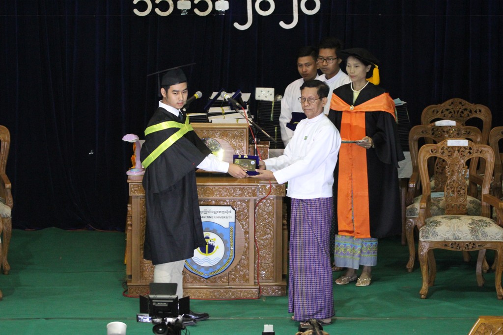 ထို့နောက် မြန်မာနိုင်ငံရေကြောင်းပညာတက္ကသိုလ် ပါမောက္ခချုပ် ဒေါက်တာမြတ်လွင် က ရေယာဉ်တည်ဆောက်မှု ပညာဘွဲ့ရ ၃၀ ၊ ရေကြောင်းအင်ဂျင်နီယာဘွဲ့ရ ၅၅ ဦး၊ ဆိပ်ကမ်း အင်ဂျင်နီယာဘွဲ့ ၂၅ ဦး၊ မြစ်ချောင်းနှင့် ကမ်းရိုးတန်း အင်ဂျင်နီယာဘွဲ့ရ ၁၀ ဦး၊ ရေကြောင်းလျှပ်စစ်နှင့် အီလက်ထရောနစ်ပညာဘွဲ့ရ ၂၃ ဦး၊ ရေကြောင်းစက်မှုအင်ဂျင်နီယာ ဘွဲ့ရ ၄၂ ဦး၊ ရေကြောင်းသိပ္ပံဂုဏ်ထူးဘွဲ့ရ ၅၅ ဦး၊ ရေကြောင်းသိပ္ပံဘွဲ့ရ ၁၁ ဦး၊ ဘွဲ့လွန် ဒီပလိုမာ ၃၃ ဦးနှင့် ထောက်ပံ့သယ်ယူပို့ဆောင်ရေးဒီပလိုမာ ၁၃၁ ဦးတို့ကို သက်ဆိုင်ရာ ဘွဲ့လက်မှတ်နှင့် ဒီပလိုမာဘွဲ့လက်မှတ်များကို ပေးအပ်သည်။