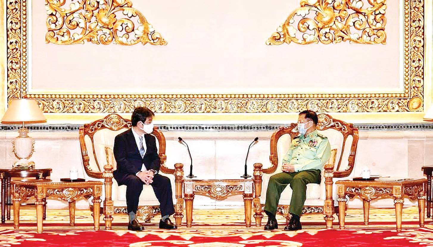 တပ်မတော်ကာကွယ်ရေးဦးစီးချုပ် ဗိုလ်ချုပ်မှူးကြီး မင်းအောင်လှိုင်သည် ဂျပန်နိုင်ငံခြားရေး ဝန်ကြီးဌာန ဝန်ကြီး မစ္စတာ မိုတဲဂိတိုရှိမိစု ဦးဆောင်သော ကိုယ်စားလှယ်အဖွဲ့အား ယနေ့ညနေပိုင်းတွင် နေပြည်တော်ရှိ ဇေယျာသီရိဗိမာန်ဧည့်ခန်းမဆောင်၌ လက်ခံတွေ့ဆုံသည်။