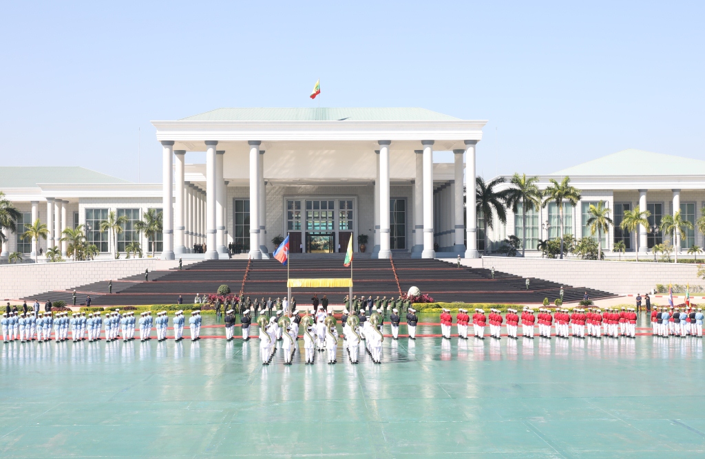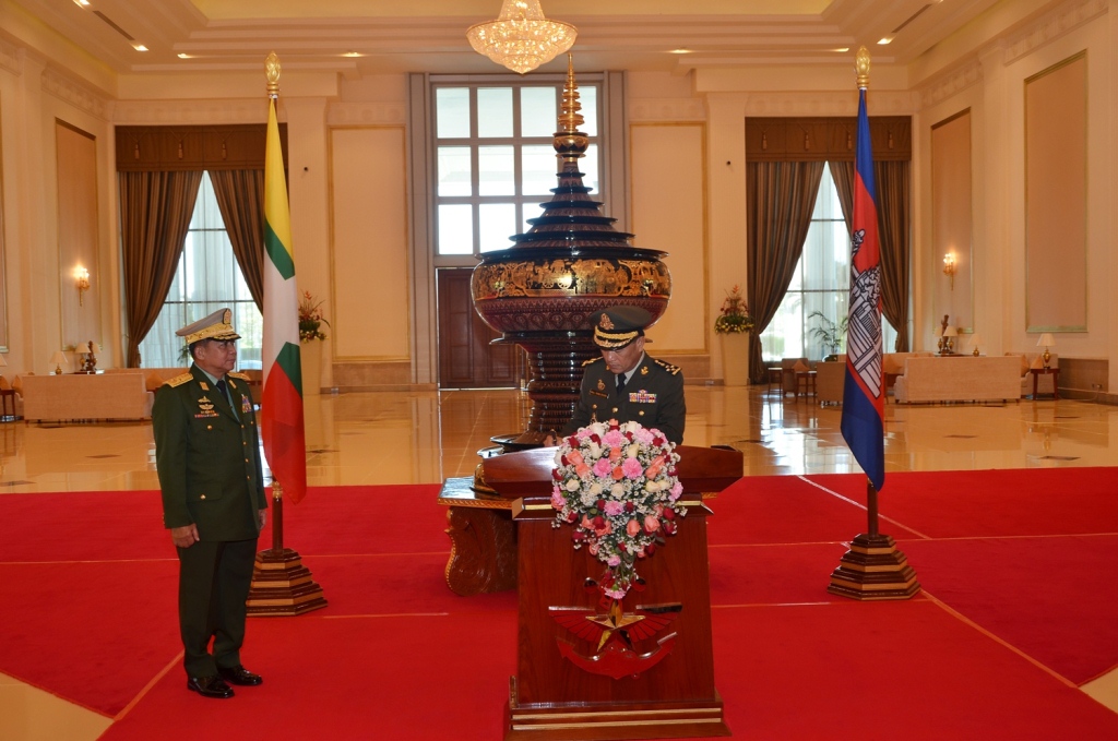 တပ်မတော်ကာကွယ်ရေးဦးစီးချုပ် ဗိုလ်ချုပ်မှူးကြီး မင်းအောင်လှိုင်သည် ကမ္ဘော ဒီးယား ဘုရင့်တပ်မတော် ကာကွယ်ရေး ဦးစီးချုပ် General Vong Pisen အား ယနေ့ နံနက်ပိုင်းတွင် နေပြည်တော်ရှိ ဇေယျာသီရိဗိမာန်ရှေ့၌ ဂုဏ်ပြုတပ်ဖွဲ့ဖြင့် ကြိုဆိုသည်။