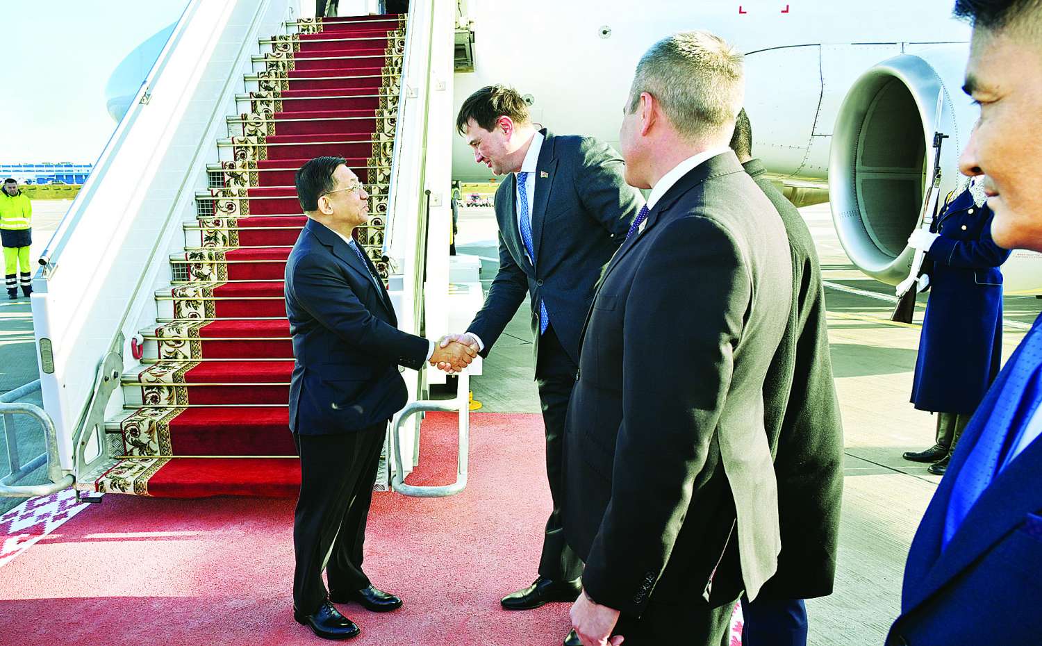 လေဆိပ်တွင် နိုင်ငံတော်စီမံအုပ်ချုပ်ရေးကောင်စီဥက္ကဋ္ဌ နိုင်ငံတော်ဝန်ကြီးချုပ် ဗိုလ်ချုပ်မှူးကြီး မင်းအောင်လှိုင်အား ဘီလာရုစ်သမ္မတနိုင်ငံနိုင်ငံတော် ဂုဏ်ပြုတပ်ဖွဲ့က နိုင်ငံတော်အဆင့် ချစ်ကြည်ရေးခရီးစဉ်လာရောက်သည့် နိုင်ငံ့ခေါင်းဆောင်များအား ကြိုဆိုသည့်အစဉ်အလာနှင့်အညီ ဂုဏ်ပြုကြိုဆိုခဲ့သည်။
