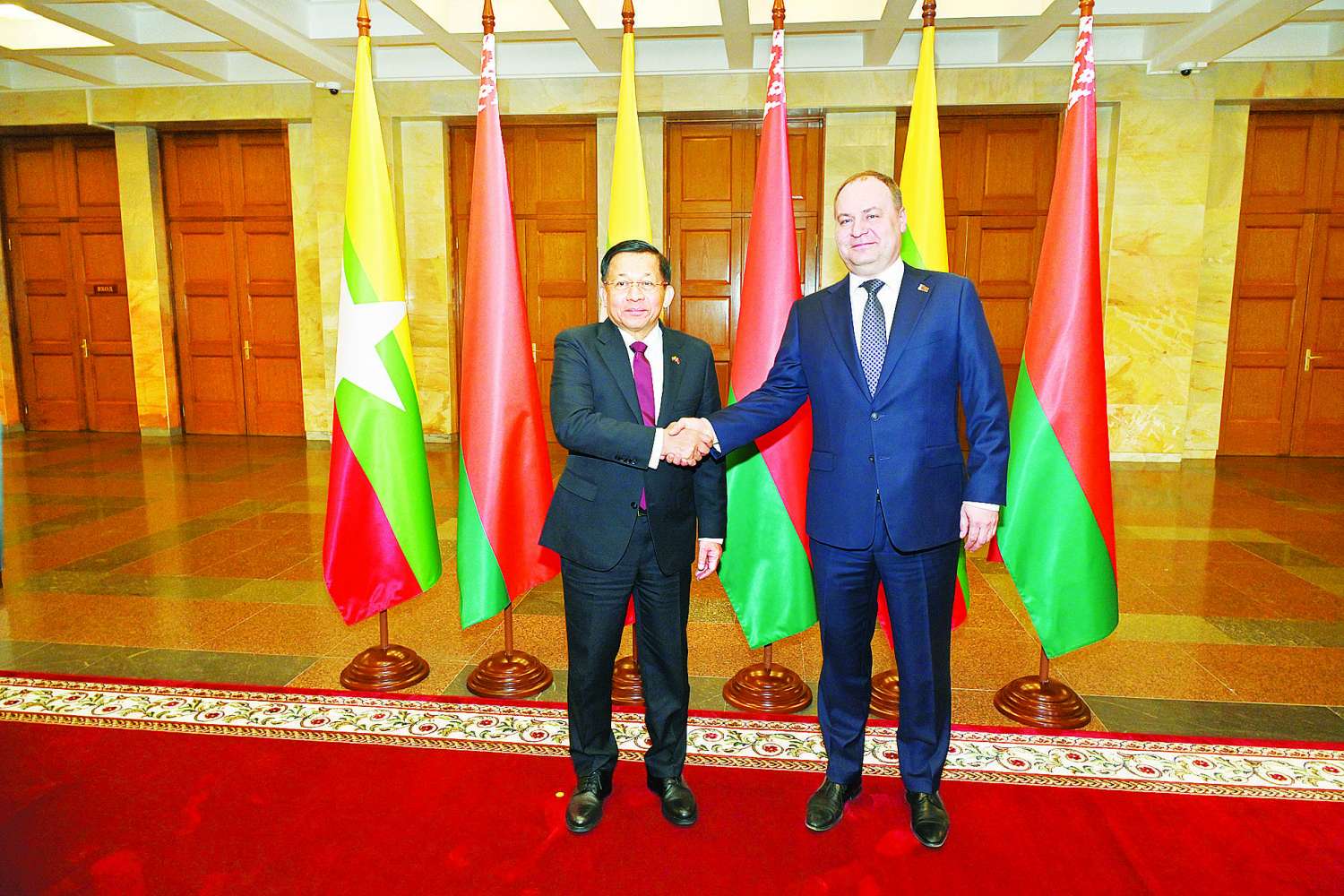 ဘယ်လာရုစ်သမ္မတနိုင်ငံ မင့်စ်မြို့၌ နိုင်ငံတော်အဆင့် ချစ်ကြည်ရေးခရီးရောက်ရှိနေသည့် နိုင်ငံတော်စီမံအုပ်ချုပ်ရေးကောင်စီဥက္ကဋ္ဌ နိုင်ငံတော်ဝန်ကြီးချုပ် ဗိုလ်ချုပ်မှူးကြီး မင်းအောင်လှိုင်သည် ဘယ်လာရုစ်သမ္မတနိုင်ငံဝန်ကြီးချုပ် H.E. Mr. Roman Alexand-rovich Golovchenko နှင့် ယနေ့ဒေသစံတော်ချိန် ညနေပိုင်းတွင် ဝန်ကြီးချုပ်ရုံးအစည်းအဝေးခန်းမ၌ တွေ့ဆုံဆွေးနွေးသည်။