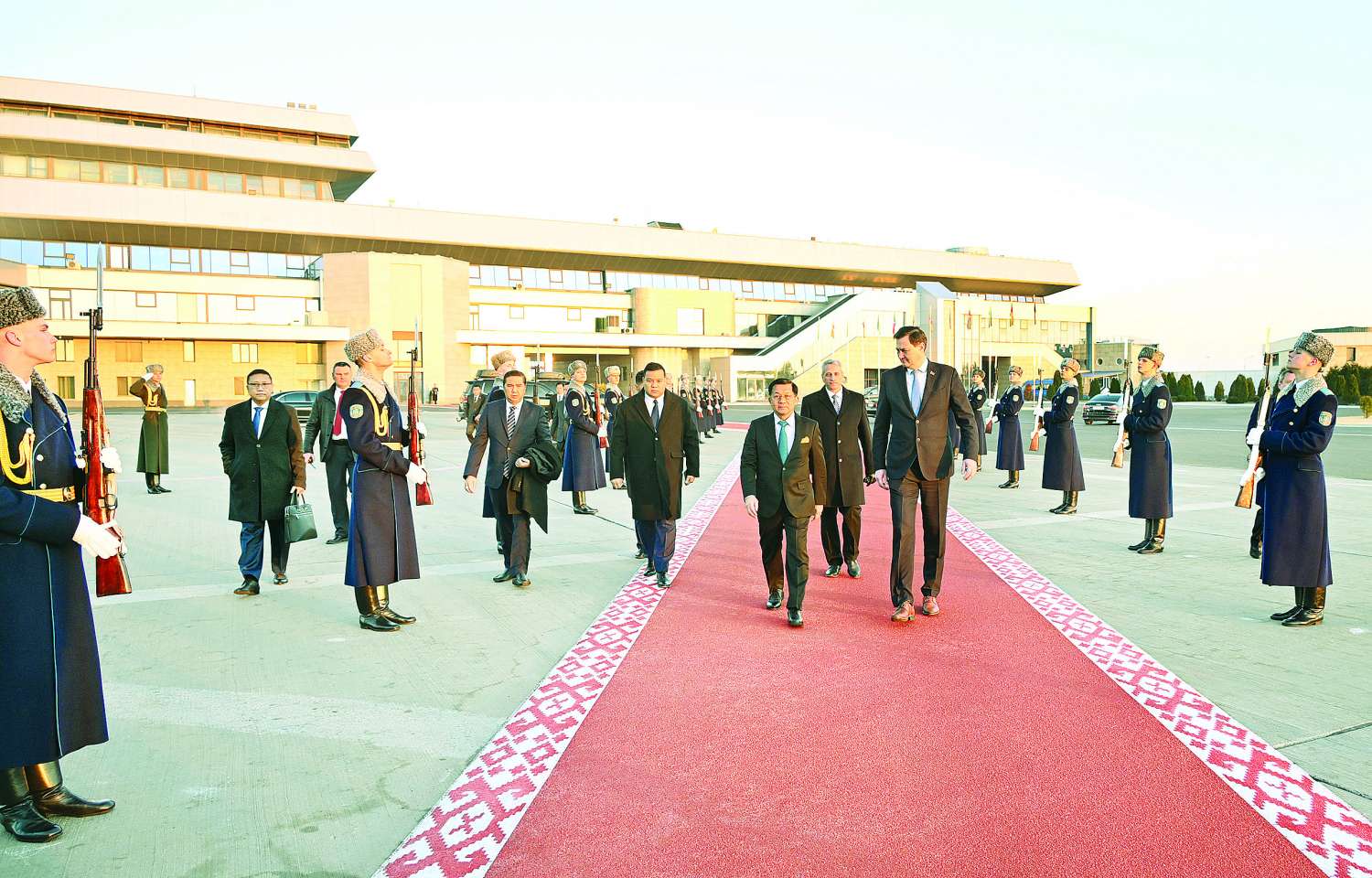 နိုင်ငံတော်စီမံအုပ်ချုပ်ရေးကောင်စီဥက္ကဋ္ဌ နိုင်ငံတော်ဝန်ကြီးချုပ် မင့်စ်မြို့ အပြည်ပြည်ဆိုင်ရာ လေဆိပ်မှထွက်ခွာစဉ် ဘယ်လာရုစ်နိုင်ငံ ဂုဏ်ပြုတပ်ဖွဲ့၏ အလေးပြုခြင်းကို ခံယူခဲ့သည်။