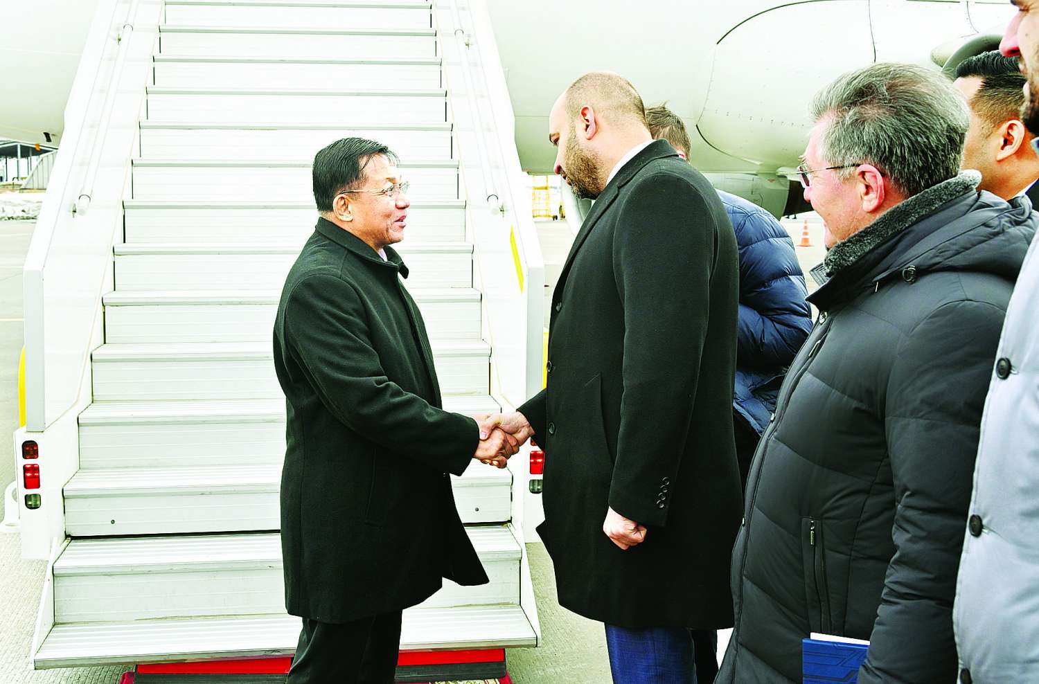 ယင်းနောက် နိုင်ငံတော်စီမံအုပ်ချုပ်ရေးကောင်စီဥက္ကဋ္ဌ နိုင်ငံတော်ဝန်ကြီးချုပ်ဦးဆောင်သည့် မြန်မာချစ်ကြည်ရေး ကိုယ်စားလှယ်အဖွဲ့သည် ရုရှားနိုင်ငံ ဆာမားရားမြို့ Kurumoch အပြည်ပြည်ဆိုင်ရာလေဆိပ်သို့ရောက်ရှိရာ ဆာမားရားမြို့ ဒေသအစိုးရအဖွဲ့အကြီးအကဲ Mr. A.V Fedor-ishchev ၊ မြန်မာနိုင်ငံဆိုင်ရာ ရုရှားဖက်ဒရေးရှင်းနိုင်ငံ သံအမတ်ကြီးနှင့် တာဝန်ရှိသူများက ကြိုဆို နှုတ်ဆက်ကြသည်။