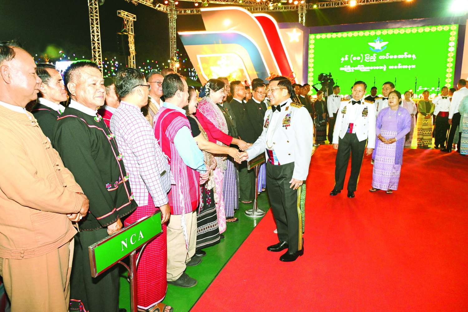 ထို့နောက် နိုင်ငံတော်စီမံအုပ်ချုပ်ရေးကောင်စီဥက္ကဋ္ဌ တပ်မတော်ကာကွယ်ရေးဦးစီးချုပ် ဗိုလ်ချုပ်မှူးကြီး မင်းအောင်လှိုင်နှင့်ဇနီး ဒေါ်ကြူကြူလှတို့သည် နှစ် (၈၀) ပြည့် တပ်မတော်နေ့အထိမ်းအမှတ် အကြိုဂုဏ်ပြုညစာစားပွဲသို့ တက်ရောက်လာကြသည့် ရုရှားဖက်ဒရေးရှင်းနိုင်ငံ ဒုတိယကာကွယ်ရေးဝန်ကြီး Colonel General Alexander Vasilyevich Fomin နှင့်အဖွဲ့ဝင်များ၊ နိုင်ငံတော်စီမံအုပ်ချုပ်ရေးကောင်စီဒုတိယဥက္ကဋ္ဌ ဒုတိယတပ်မတော်ကာကွယ်ရေးဦးစီးချုပ် ကာကွယ်ရေးဦးစီးချုပ် (ကြည်း) ဒုတိယဗိုလ်ချုပ်မှူးကြီး စိုးဝင်းနှင့်ဇနီး ဒေါ်သန်းသန်းနွယ်၊ ညှိနှိုင်းကွပ်ကဲရေးမှူး (ကြည်း၊ ရေ၊ လေ) ဗိုလ်ချုပ်ကြီး ကျော်စွာလင်းနှင့်ဇနီး၊ ကာကွယ်ရေးဦးစီးချုပ် (ရေ) ဗိုလ်ချုပ်ကြီး ထိန်ဝင်းနှင့်ဇနီး၊ ကာကွယ်ရေးဦးစီးချုပ် (လေ) ဗိုလ်ချုပ်ကြီး ထွန်းအောင်နှင့်ဇနီး၊ ကောင်စီအတွင်းရေးမှူးနှင့်ဇနီး၊ တွဲဖက်အတွင်းရေးမှူးနှင့်ဇနီး၊ ကောင်စီဝင်များနှင့်ဇနီးများ၊ ပြည်ထောင်စုအဆင့်ပုဂ္ဂိုလ်များ၊ ပြည်ထောင်စုဝန်ကြီးများနှင့်ဇနီးများ၊ ကာကွယ်ရေးဦးစီးချုပ်ရုံးမှ အဆင့်မြင့်တပ်မတော်အရာရှိကြီးများနှင့်ဇနီးများ၊ ရဲဘော်သုံးကျိပ်ဝင် မိသားစုဝင်များ၊ အငြိမ်းစားတပ်မတော်ကာကွယ်ရေးဦးစီးချုပ်များ၏ မိသားစုဝင်များ၊ အငြိမ်းစားတပ်မတော် (ကြည်း၊ ရေ၊ လေ) အရာရှိကြီးများ၊ လွတ်လပ်ရေးမော်ကွန်းဝင် ပထမဆင့်၊ ဒုတိယဆင့်နှင့် တတိယဆင့် မော်ကွန်းဝင်ပုဂ္ဂိုလ်များ၊ အကြံပေးပုဂ္ဂိုလ်များ၊ ဒုတိယဝန်ကြီးများ၊ တပ်မတော်သား အငြိမ်းစားသံအမတ်ကြီးများ၊ နေပြည်တော်ကောင်စီဝင်များ၊ နိုင်ငံခြားစစ်သံရုံးများမှ စစ်သံမှူးများနှင့် တာဝန်ရှိသူများ၊ တစ်နိုင်ငံလုံးပစ်ခတ်တိုက်ခိုက်မှုရပ်စဲရေးသဘောတူစာချုပ် (NCA) လက်မှတ်ရေးထိုးထားသည့် တိုင်းရင်းသားလက်နက်ကိုင်အဖွဲ့များမှ ကိုယ်စားလှယ်များ၊ နိုင်ငံရေးပါတီများမှဥက္ကဋ္ဌများနှင့် တာဝန်ရှိသူများ၊ အောင်ဆန်းသူရိယဘွဲ့ရရှိခဲ့သူများ၏ မိသားစုဝင်များနှင့် ဆွေမျိုးများ၊ သီဟသူရဘွဲ့၊ သူရဘွဲ့နှင့် တပ်မတော်စွမ်းရည် သတ္တိဆိုင်ရာ ဂုဏ်ထူးဆောင်ဘွဲ့၊ သူရဲကောင်းမှတ်တမ်းဝင် တံဆိပ်ရရှိခဲ့ကြသည့် အရာရှိ၊ စစ်သည်များနှင့် မိသားစုဝင်များ၊ ဆွေမျိုးများ၊ မြန်မာနိုင်ငံစစ်မှု ထမ်းဟောင်းအဖွဲ့ဝင်များ၊ အသွင်ပြောင်းပြည်သူ့စစ်၊ မူလပြည်သူ့စစ်နှင့် နယ်ခြားစောင့်ဗဟိုအကြံပေး ကွပ်ကဲရေးအဖွဲ့များ၊ မြန်မာနိုင်ငံရဲတပ်ဖွဲ့၊ မီးသတ်တပ်ဖွဲ့နှင့် မြန်မာနိုင်ငံကြက်ခြေနီတပ်ဖွဲ့တို့မှပုဂ္ဂိုလ်များ၊ ဝန်ကြီးဌာနအသီးသီးမှ တာဝန်ရှိသူများနှင့်ဝန်ထမ်းများ၊ ဝိုင်အမ်ဘီအေအသင်းကြီး၊ မြန်မာနိုင်ငံအမျိုးသမီးရေးရာအဖွဲ့ချုပ်၊ မြန်မာနိုင်င