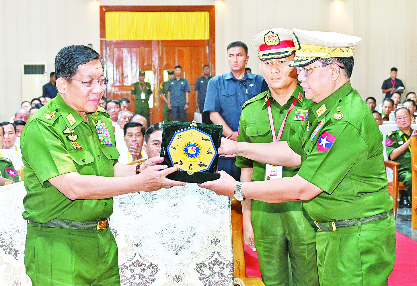 (၇၅)နှစ်မြောက် စိန်ရတုကာကွယ်ရေးပစ္စည်းထုတ်လုပ်မှုတပ်ဖွဲ့နေ့ အခမ်းအနားကို ယနေ့နံနက်ပိုင်းတွင် နေပြည်တော်ကောင်စီနယ်မြေအတွင်းရှိ နယ်မြေခံတပ်ဌာနချုပ်ခန်းမ၌ ကျင်းပပြုလုပ်ရာ နိုင်ငံတော်စီမံအုပ်ချုပ်ရေးကောင်စီဥက္ကဋ္ဌ တပ်မတော်ကာကွယ်ရေးဦးစီးချုပ် ဗိုလ်ချုပ်မှူးကြီး မင်းအောင်လှိုင် တက်ရောက်ချီးမြှင့်သည်။