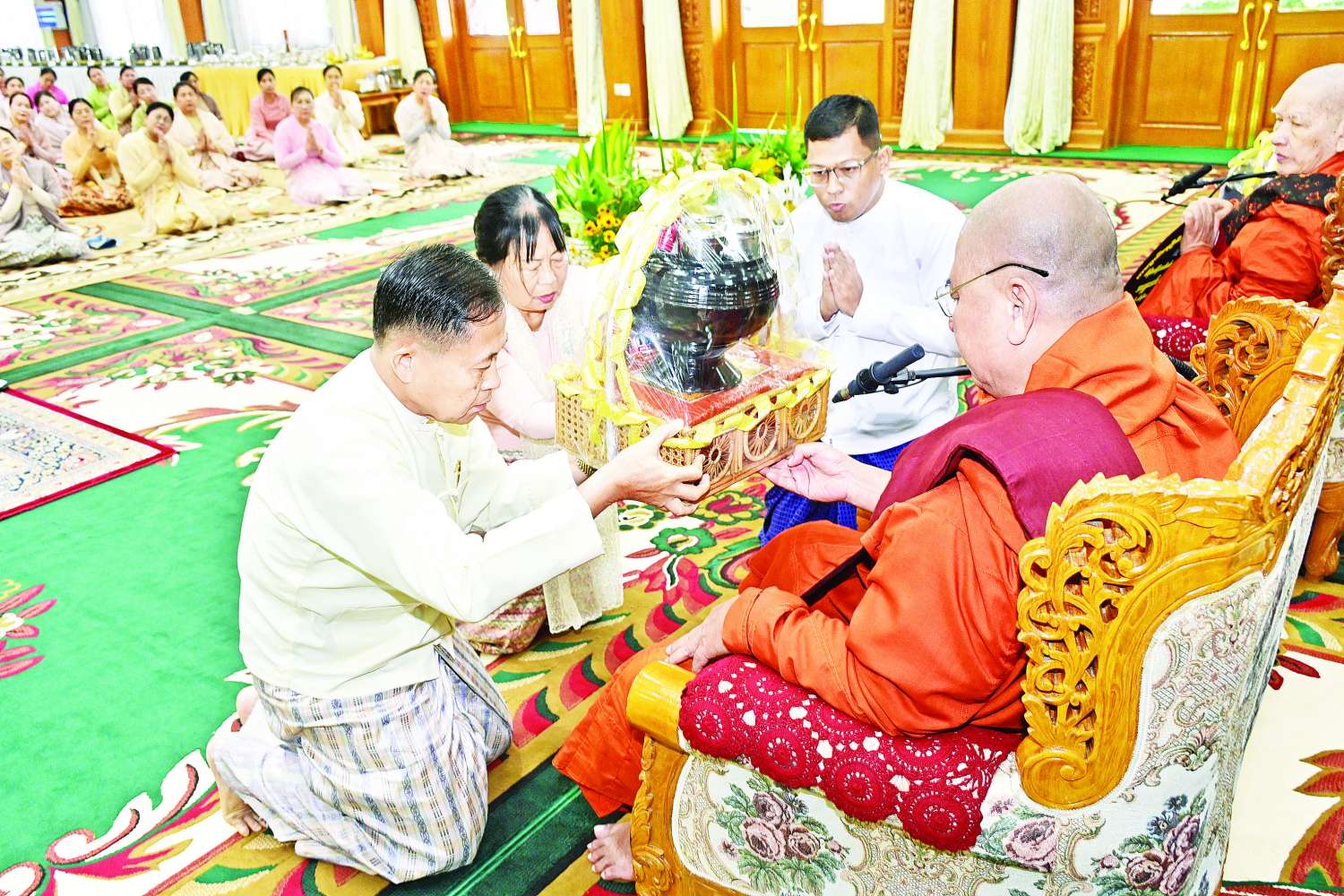 ၂၀၂၅ ခုနှစ်၊ ကာကွယ်ရေးဦးစီးချုပ်ရုံး (ကြည်း၊ ရေ၊ လေ) မိသားစုများ ဝါဆိုသင်္ကန်းဆက်ကပ်လှူဒါန်းပွဲ မင်္ဂလာအခမ်းအနားကို ယနေ့နံနက်ပိုင်းတွင် ကာကွယ်ရေးဦးစီးချုပ်ရုံး (ကြည်း)၊ အနော်ရထာခန်းမ၌ ကျင်းပပြုလုပ်ရာ နိုင်ငံတော်စီမံအုပ်ချုပ်ရေးကောင်စီဥက္ကဋ္ဌ တပ်မတော်ကာကွယ်ရေးဦးစီးချုပ် ဗိုလ်ချုပ်မှူးကြီး မင်းအောင်လှိုင်နှင့် ဇနီး ဒေါ်ကြူကြူလှတို့ တက်ရောက်ကြည်ညို၍ ဝါဆိုသင်္ကန်း၊ လှူဖွယ်ပစ္စည်းများနှင့် နေ့ဆွမ်းတို့ကို ဆက်ကပ်လှူဒါန်းသည်။