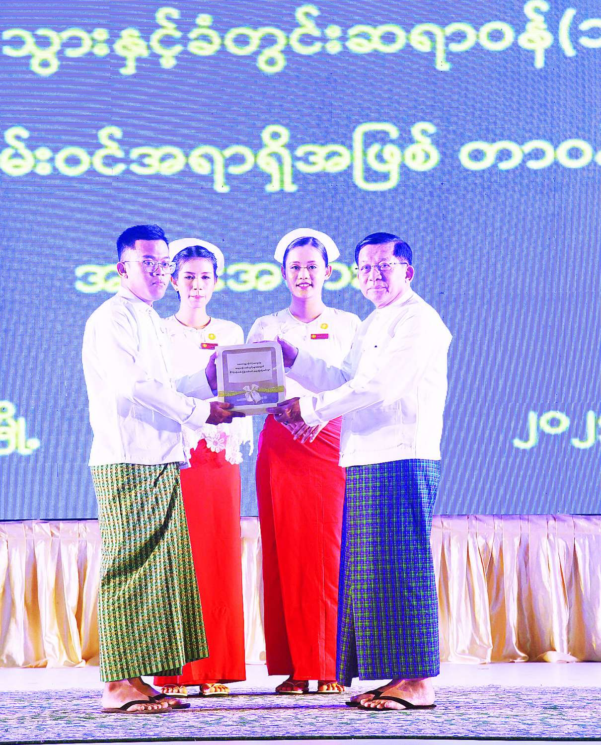 နိုင်ငံတော်စီမံအုပ်ချုပ်ရေးကောင်စီအနေဖြင့် “လူ့အသက်ထက် အရေးကြီးတာ ဘာမှမရှိ” ဆိုသည်ကို ဦးထိပ်ထားပြီး ကြိုးပမ်းဆောင်ရွက်လျက်ရှိကြောင်း၊ လူတိုင်းလက်လှမ်းမီသည့် အရည်အသွေးပြည့်ဝသည့် ကျန်းမာရေးစောင့်ရှောက်မှုများကို ပြည်သူလူထု၏ ကိုယ်ပိုင်ငွေကြေးကုန်ကျရမှုသက်သာစွာဖြင့် ရရှိစေရေး အစွမ်းကုန်ကြိုးစားအားထုတ်လျက်ရှိရာ ကျန်းမာရေးဝန်ကြီးဌာန၏ ပြန်တမ်းဝင်အရာရှိများအဖြစ် ယနေ့ခန့်အပ်မည့် မောင်တို့မယ်တို့အနေဖြင့် တာဝန်ကျရာ ဆေးရုံများ၌ ပြည်သူများကို ကိုယ်စွမ်းဉာဏ်စွမ်းအပြည့်ဖြင့် ကုသစောင့်ရှောက်မှုပေးပြီး နိုင်ငံ့အကျိုးပြုကျန်းမာရေးဝန်ထမ်းကောင်းများ ဖြစ်ကြစေရန် ဆန္ဒပြုဆုမွန်ကောင်းတောင်းပါကြောင်းဖြင့် ပြောကြားသည်။
