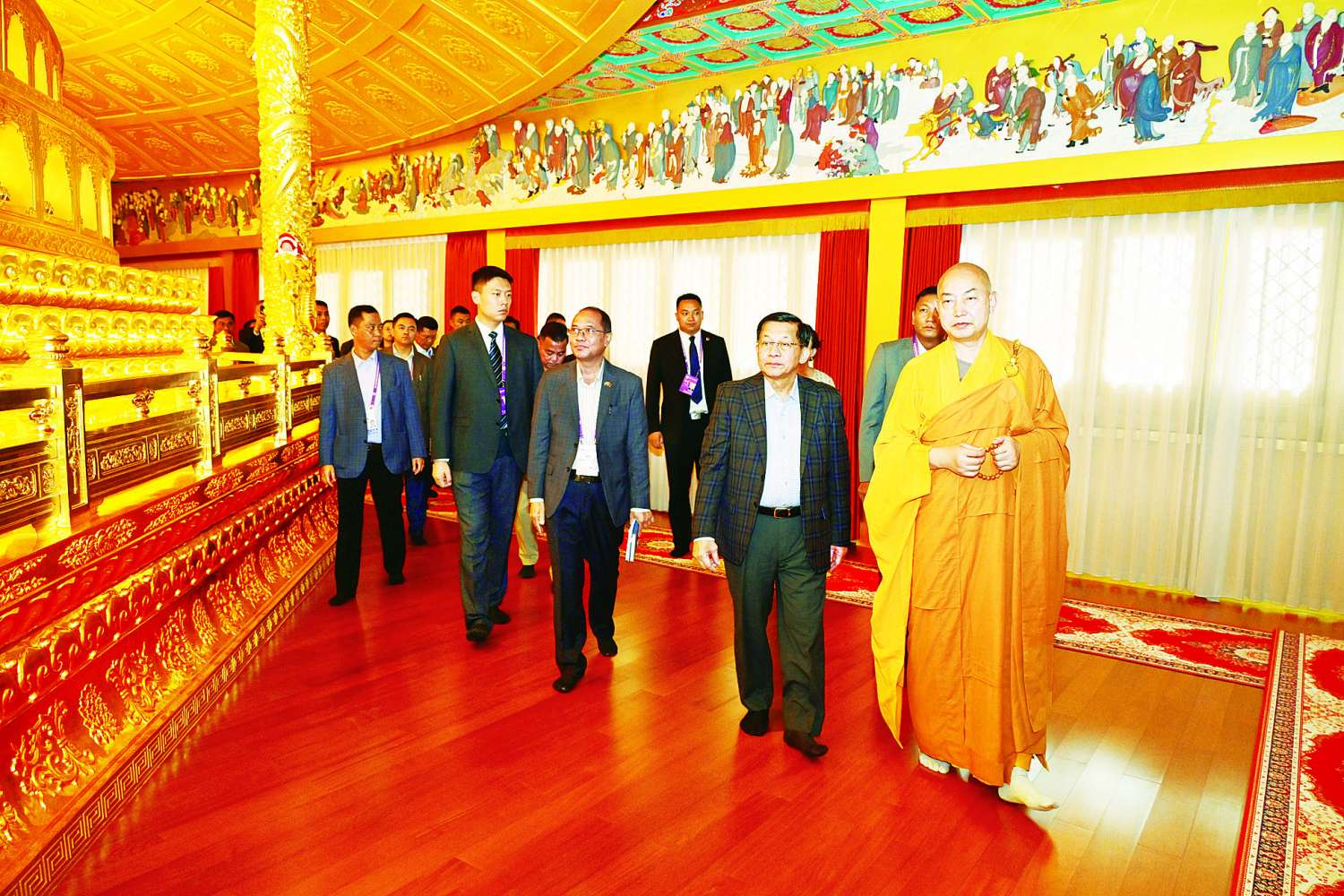 ဦးစွာ ပြည်ထောင်စုသမ္မတမြန်မာနိုင်ငံတော် ယာယီသမ္မတ နိုင်ငံတော်လုံခြုံရေးနှင့် အေးချမ်းသာယာရေးကော်မရှင်ဥက္ကဋ္ဌ ဦးဆောင်သည့် မြန်မာကိုယ်စားလှယ်အဖွဲ့သည် လင်ကွမ်းဘုရားကျောင်းသို့ ရောက်ရှိကြရာ ကျောင်းတိုက်မှ တာဝန်ရှိသူများနှင့် ဒေသခံဗုဒ္ဓဘာသာဝင်များက ကြိုဆိုနှုတ်ဆက်ကြသည်။
