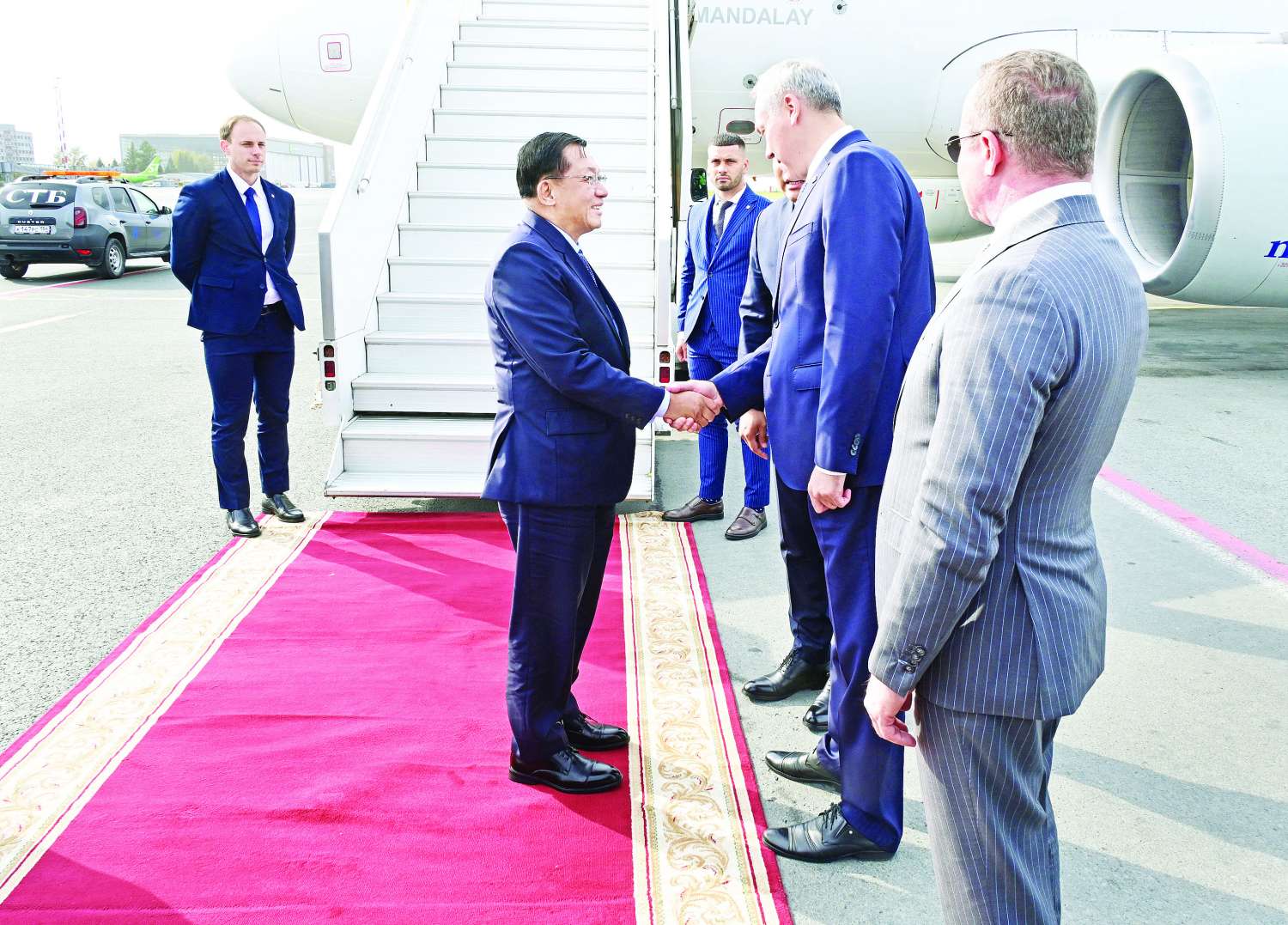 ထို့နောက် ပြည်ထောင်စုသမ္မတမြန်မာနိုင်ငံတော် ယာယီသမ္မတ နိုင်ငံတော်လုံခြုံရေးနှင့် အေးချမ်းသာယာရေးကော်မရှင်ဥက္ကဋ္ဌ ဦးဆောင်သည့် မြန်မာအဆင့်မြင့်ကိုယ်စားလှယ်အဖွဲ့သည် ညပိုင်းတွင် မော်စကိုမြို့ရှိ ဘနူကာဘာအပြည်ပြည်ဆိုင်ရာ လေဆိပ်သို့ ရောက်ရှိကြရာ ရုရှားဖက်ဒရေးရှင်းနိုင်ငံ နိုင်ငံခြားရေးဝန်ကြီးဌာန ဒုတိယဝန်ကြီး Mr. Andrey Rudenko နှင့် တာဝန်ရှိသူများ၊ ရုရှားဖက်ဒရေးရှင်းနိုင်ငံဆိုင်ရာ မြန်မာနိုင်ငံသံအမတ်ကြီး ဦးသစ်လင်းအုန်း၊ မြန်မာစစ်သံ (ကြည်း၊ ရေ၊လေ) ဗိုလ်မှူးချုပ် ကျော်စိုးဦးတို့က လှိုက်လှဲနွေးထွေးစွာ ကြိုဆိုနှုတ်ဆက်ခဲ့ကြကြောင်း သတင်းရရှိသည်။