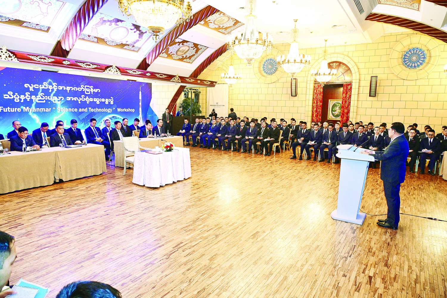 ထို့နောက် သိပ္ပံပညာရပ်ဆိုင်ရာ အလုပ်ရုံ ဆွေးနွေးပွဲကို စတင်ကျင်းပပြုလုပ်ရာ ပြည်ထောင်စုသမ္မတမြန်မာနိုင်ငံတော် ယာယီသမ္မတ နိုင်ငံတော်လုံခြုံရေးနှင့်အေးချမ်းသာယာရေးကော်မရှင်ဥက္ကဋ္ဌက အမှာစကားပြောကြားရာ ယနေ့ကျင်းပသည့် “လူငယ်နှင့် အနာဂတ်မြန်မာ” သိပ္ပံနှင့်နည်းပညာဆိုင်ရာအလုပ်ရုံဆွေးနွေးပွဲသည် အနာဂတ်မြန်မာနိုင်ငံတွင် ကြုံတွေ့လာနိုင်သည့် သိပ္ပံနှင့်နည်းပညာဆိုင်ရာ စိန်ခေါ်မှုများ၊ လိုအပ်ချက်များကို ဖြည့်ဆည်းအဖြေရှာနိုင်စေရန်၊ သိပ္ပံနှင့်နည်းပညာ ဖွံ့ဖြိုးတိုးတက်ရေးလုပ်ငန်းများတွင် လူငယ်များ စိတ်အားထက်သန်စွာဖြင့် ပူးပေါင်းပါဝင်လာစေရေး ခေတ်မီဆန်းသစ်ပြီး စဉ်းစားတွေးခေါ်နိုင်မှုမြင့်မားသည့် ပညာတတ်လူငယ်များဖြစ်လာစေရန်၊ သိပ္ပံနှင့်နည်းပညာကဏ္ဍ ဖွံ့ဖြိုးတိုးတက်စေရန်နှင့် လူငယ်များ၏စွမ်းဆောင်နိုင်မှုအပေါ် မြှင့်တင်အားပေးနိုင်ရန် စသည့်ရည်ရွယ်ချက်များဖြင့် ယခုဆွေးနွေးပွဲကို ကျင်းပပြုလုပ်ခြင်းဖြစ်ကြောင်း။