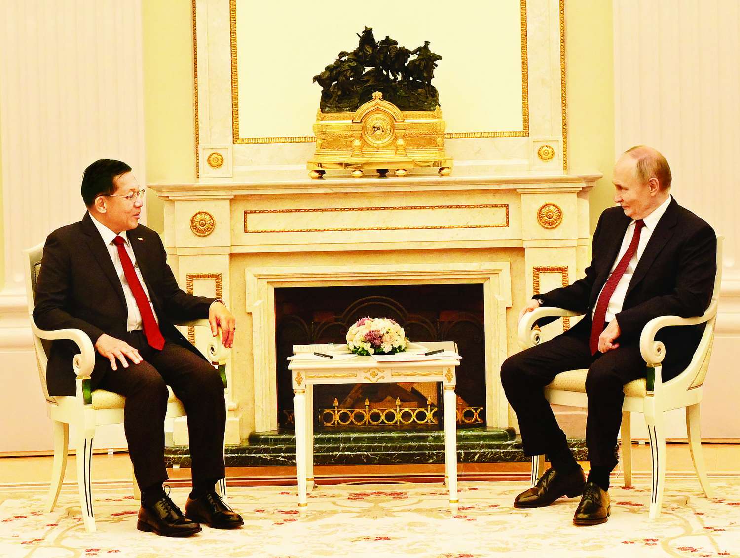 ရုရှားဖက်ဒရေးရှင်းနိုင်ငံသမ္မတ မစ္စတာဗလာဒီမာပူတင်၏ ဖိတ်ကြားချက်အရ ရုရှားဖက်ဒရေးရှင်းနိုင်ငံသို့ အလုပ်သဘောခရီးရောက်ရှိနေသည့် ပြည်ထောင်စုသမ္မတမြန်မာနိုင်ငံတော် ယာယီသမ္မတ နိုင်ငံတော်လုံခြုံရေးနှင့်အေးချမ်းသာယာရေးကော်မရှင်ဥက္ကဋ္ဌ ဗိုလ်ချုပ်မှူးကြီး မင်းအောင်လှိုင်သည် ယနေ့ညပိုင်းတွင် မော်စကိုမြို့ ကရင်မလင်နန်းတော်၌ ရုရှားဖက်ဒရေးရှင်းနိုင်ငံသမ္မတ H.E. Vladimir Vladimirovich Putin နှင့် တွေ့ဆုံဆွေးနွေးသည်။