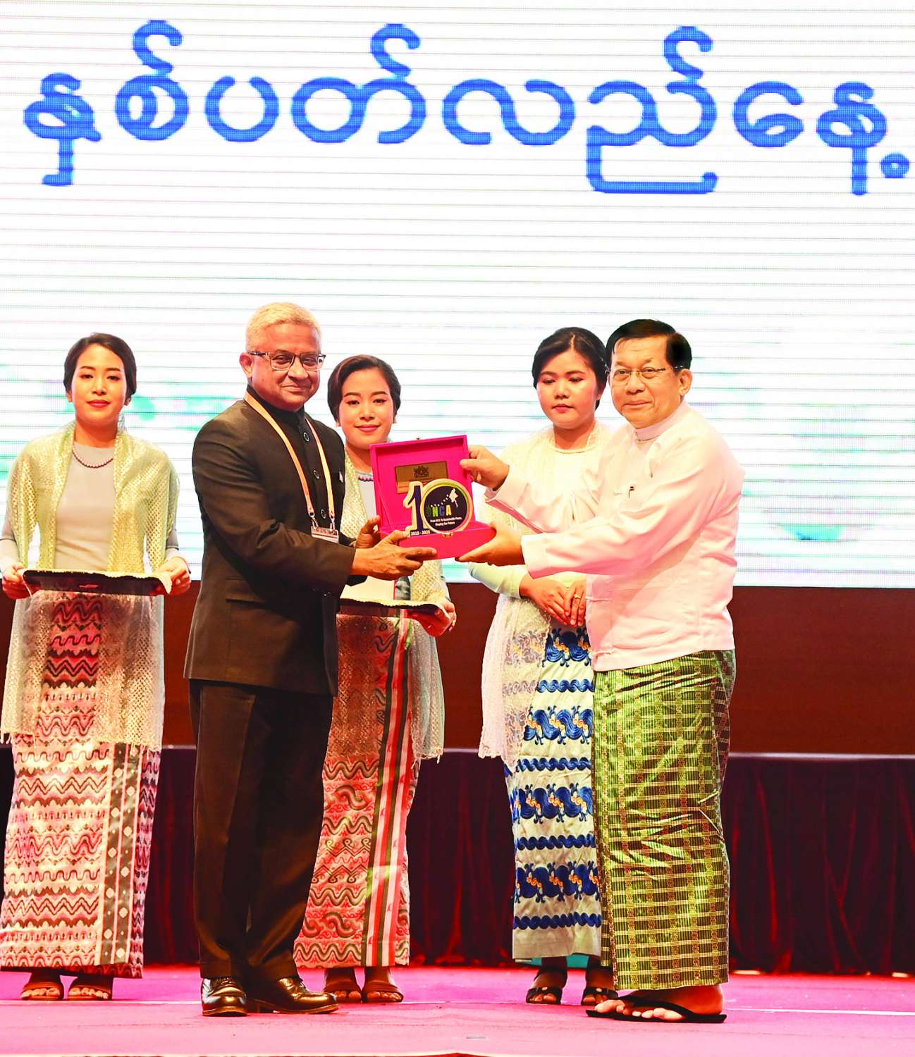 ယင်းနောက် နိုင်ငံတော်ယာယီသမ္မတ နိုင်ငံတော်လုံခြုံရေးနှင့် အေးချမ်းသာယာရေးကော်မရှင် ဥက္ကဋ္ဌ အမျိုးသားစည်းလုံးညီညွတ်ရေးနှင့် ငြိမ်းချမ်းရေးဖော်ဆောင်မှုဗဟိုကော်မတီ ဥက္ကဋ္ဌ ဗိုလ်ချုပ်မှူးကြီး မင်းအောင်လှိုင်သည် ပြန်ကြားရေးဝန်ကြီးဌာန မြန်မာ့အသံနှင့်ရုပ်မြင်သံကြား၊ သာသနာရေးနှင့်ယဉ်ကျေးမှုဝန်ကြီးဌာန၊ အနုပညာဦးစီးဌာနတို့မှ အကအဖွဲ့များနှင့် တိုင်းရင်းသားအကအဖွဲ့များကို “ငြိမ်းချမ်းရေးဂုဏ်ပြုပန်းခြင်း” နှင့် ဂုဏ်ပြုချီးမြှင့်ငွေ သိန်း ၁၀၀၀ အား ပေးအပ်ချီးမြှင့်ပြီး တိုင်းရင်းသားအကအဖွဲ့များနှင့်အတူ စုပေါင်းမှတ်တမ်းတင်ဓာတ်ပုံရိုက်ကူးကြသည်။ အခမ်းအနားအပြီးတွင် နိုင်ငံတော်ယာယီသမ္မတ နိုင်ငံတော်လုံခြုံရေးနှင့် အေးချမ်းသာယာရေးကော်မရှင် ဥက္ကဋ္ဌ အမျိုးသားစည်းလုံးညီညွတ်ရေးနှင့် ငြိမ်းချမ်းရေးဖော်ဆောင်မှု ဗဟိုကော်မတီ ဥက္ကဋ္ဌ ဗိုလ်ချုပ်မှူးကြီး မင်းအောင်လှိုင်သည် တစ်နိုင်ငံလုံး ပစ်ခတ်တိုက်ခိုက်မှုရပ်စဲရေး သဘောတူစာချုပ် (NCA) (၁၀)နှစ်ပြည့် နှစ်ပတ်လည်နေ့ အခမ်းအနားသို့ တက်ရောက်လာကြသူများကို ဂုဏ်ပြုနေ့လယ်စာဖြင့် တည်ခင်းဧည့်ခံခဲ့ကြောင်း သတင်းရရှိသည်။