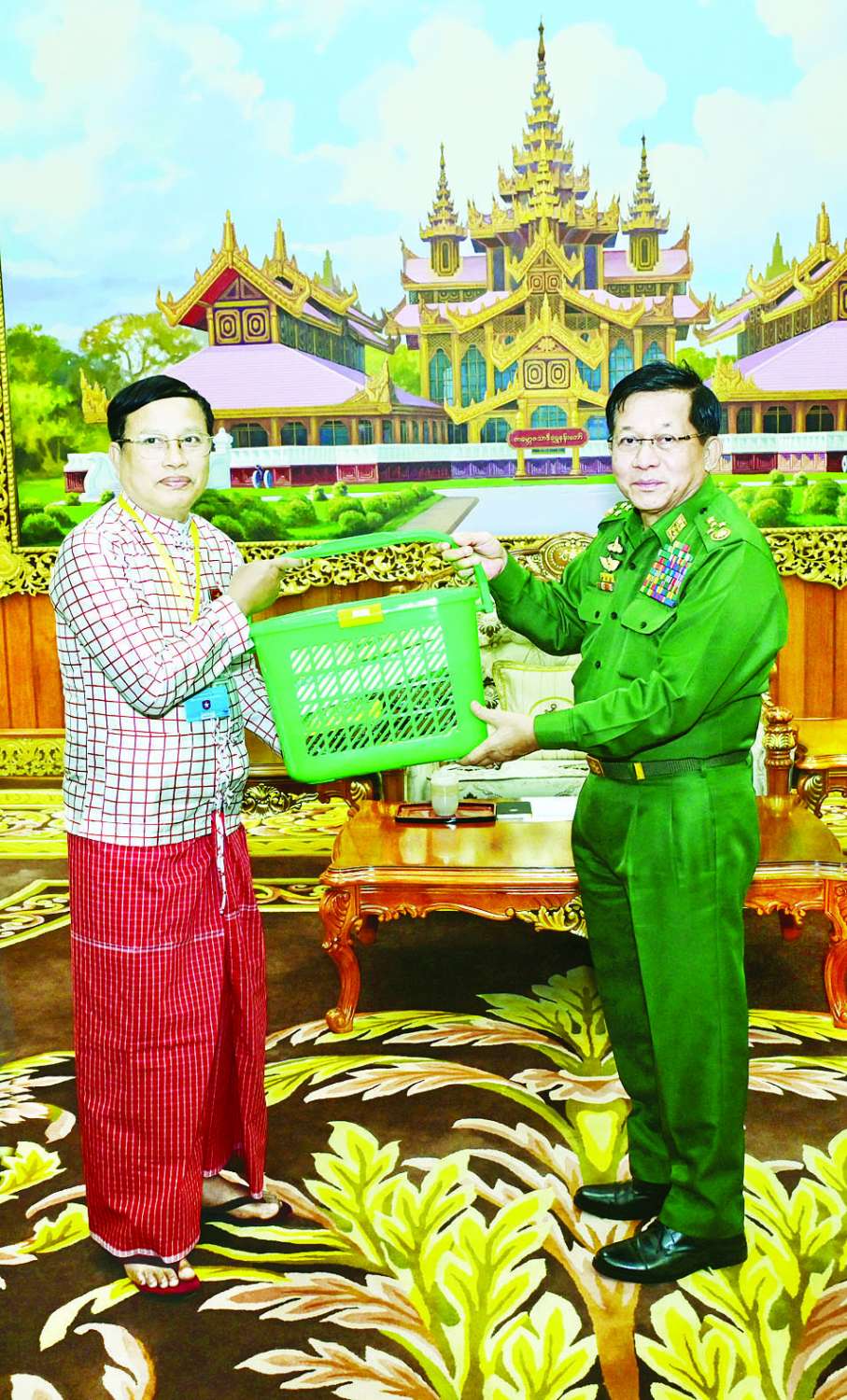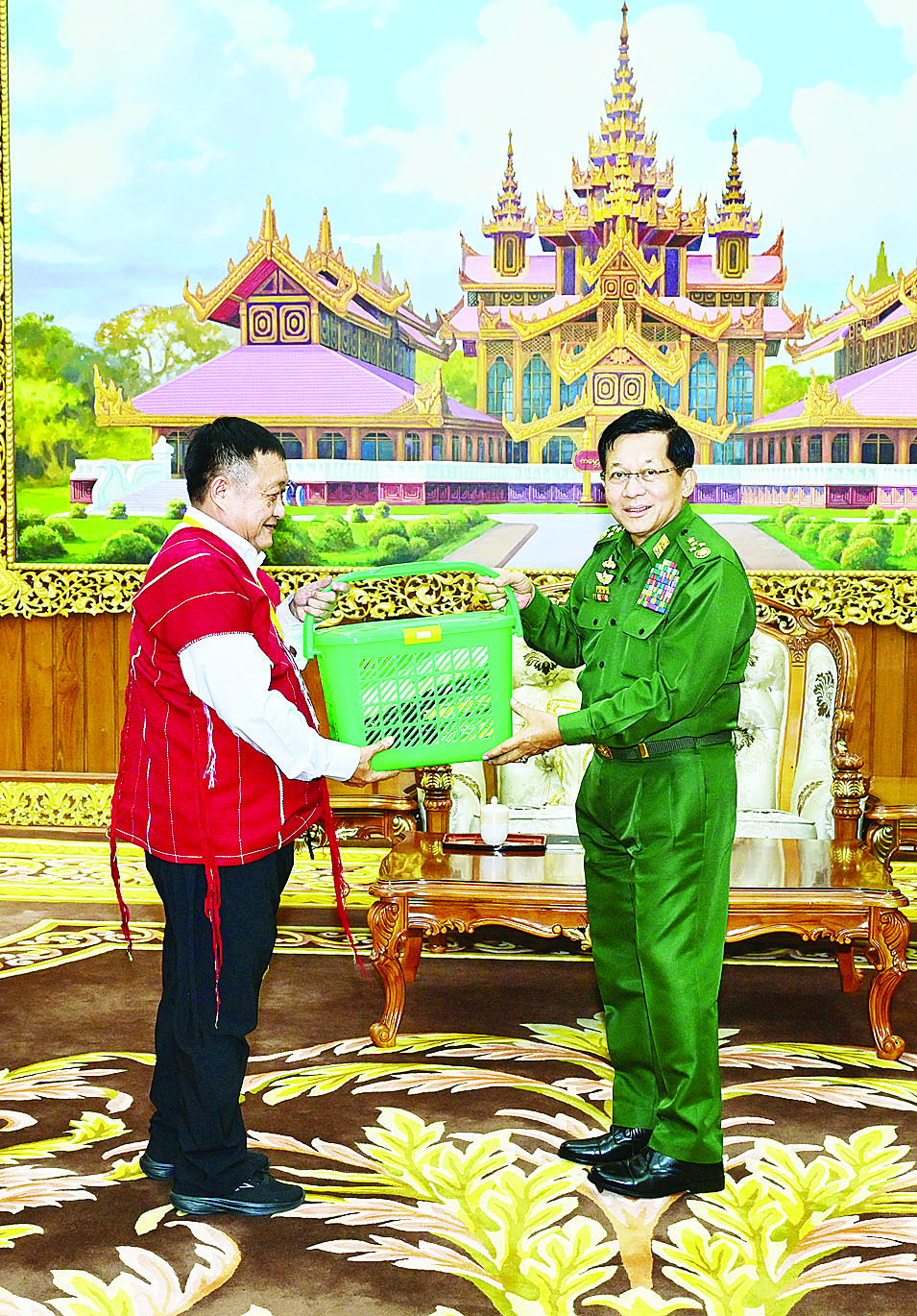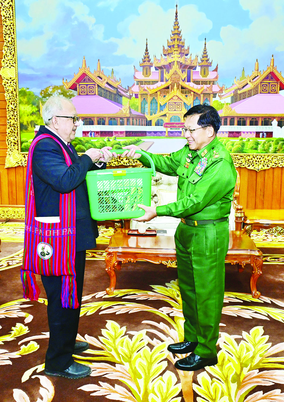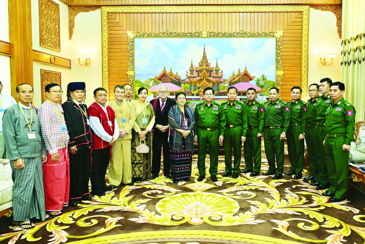 နိုင်ငံတော်လုံခြုံရေးနှင့် အေးချမ်းသာယာရေးကော်မရှင်ဥက္ကဋ္ဌ တပ်မတော်ကာကွယ်ရေးဦးစီးချုပ် ဗိုလ်ချုပ်မှူးကြီး မင်းအောင်လှိုင်ထံသို့ ငြိမ်းချမ်းရေးဆွေးနွေးပွဲသို့ တက်ရောက်ခဲ့သည့် တိုင်းရင်းသားလက်နက်ကိုင်ကိုယ်စားလှယ်အဖွဲ့များက ယနေ့နံနက်ပိုင်းတွင် နေပြည်တော်ရှိ ဘုရင့်နောင်ရိပ်သာဧည့်ခန်းမ၌ လာရောက်ဂါရဝပြုတွေ့ဆုံသည်။